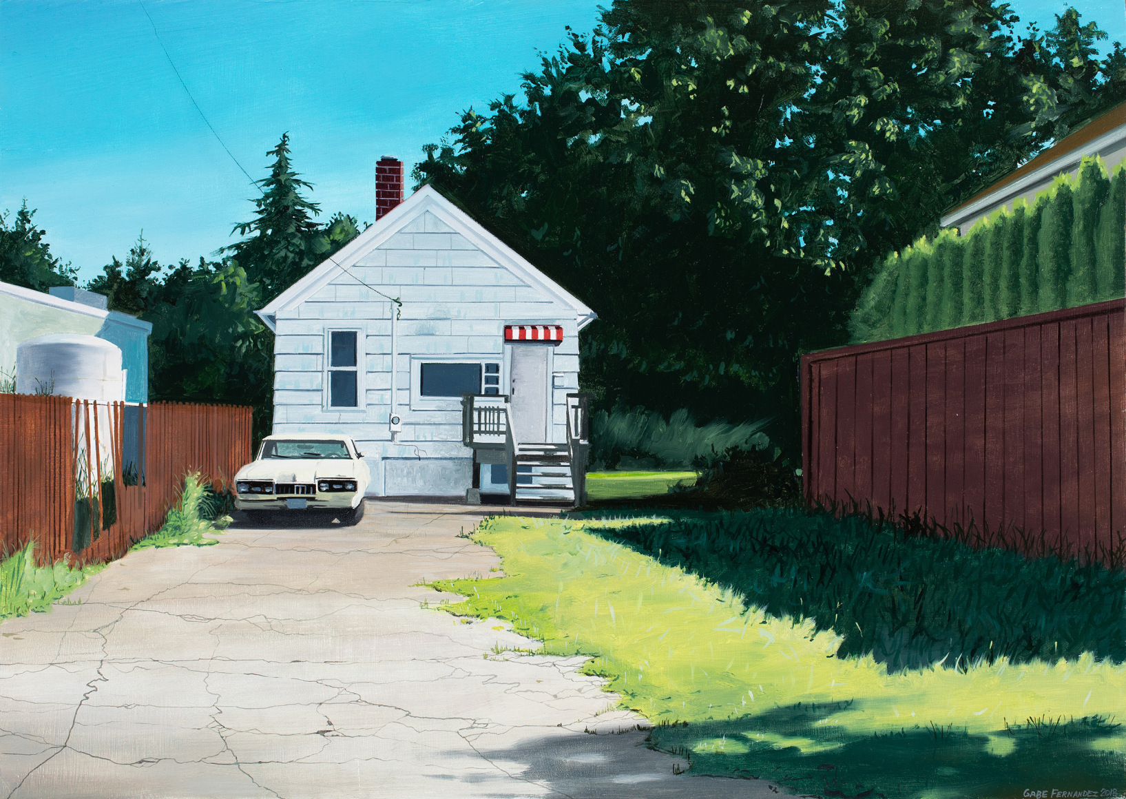 In the exhibition Familiar Voices, Gabe Fernandez explores a crisp and crystalline West Coast lodged in our collective memory. Depictions of grain elevators, Airstream trailers, old vans and airplanes are contrasted against an ever-present blue sky. They seem at once both specific and universal. Old driveways and abandoned gas stations – we’ve been there. They feel like old friends. Fernandez presents them in a clear, unpolluted light.