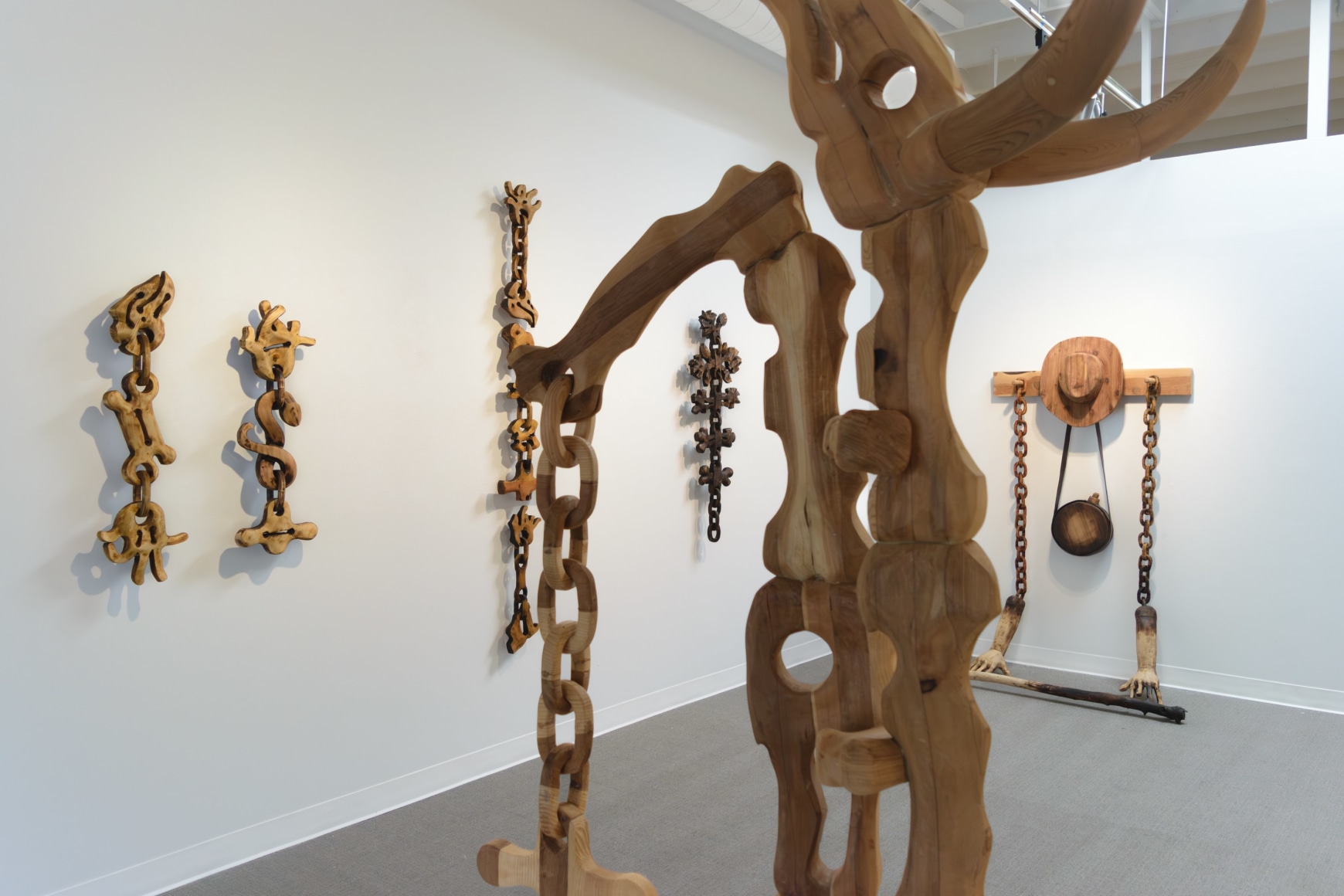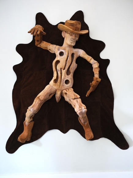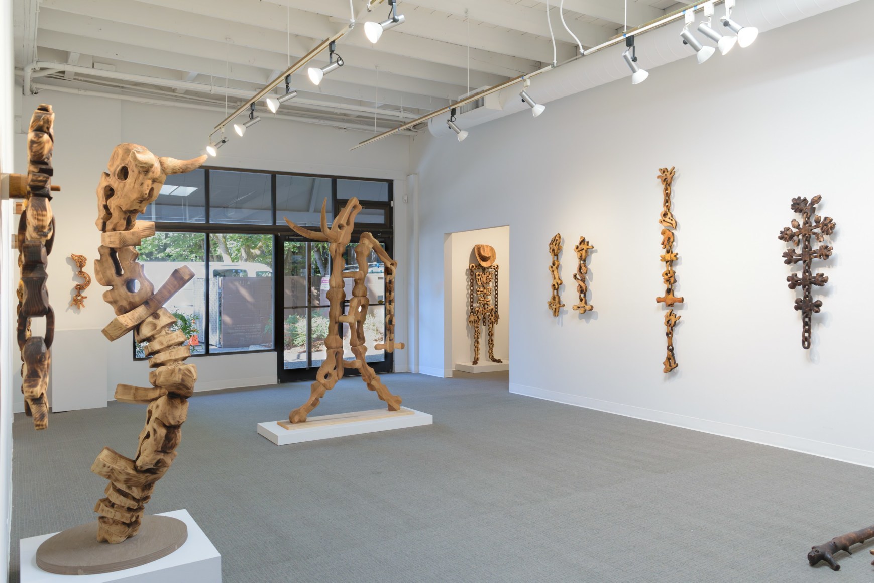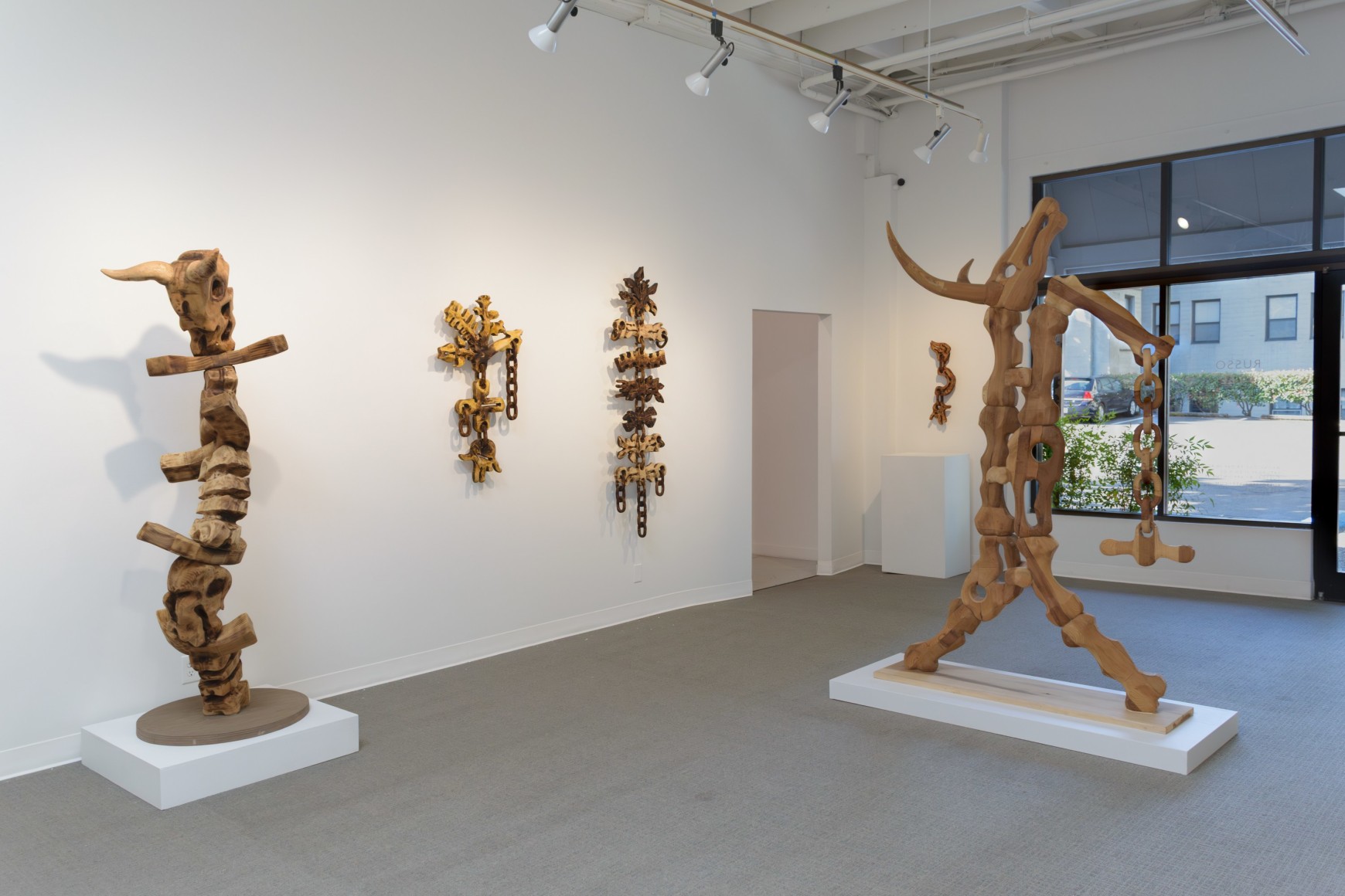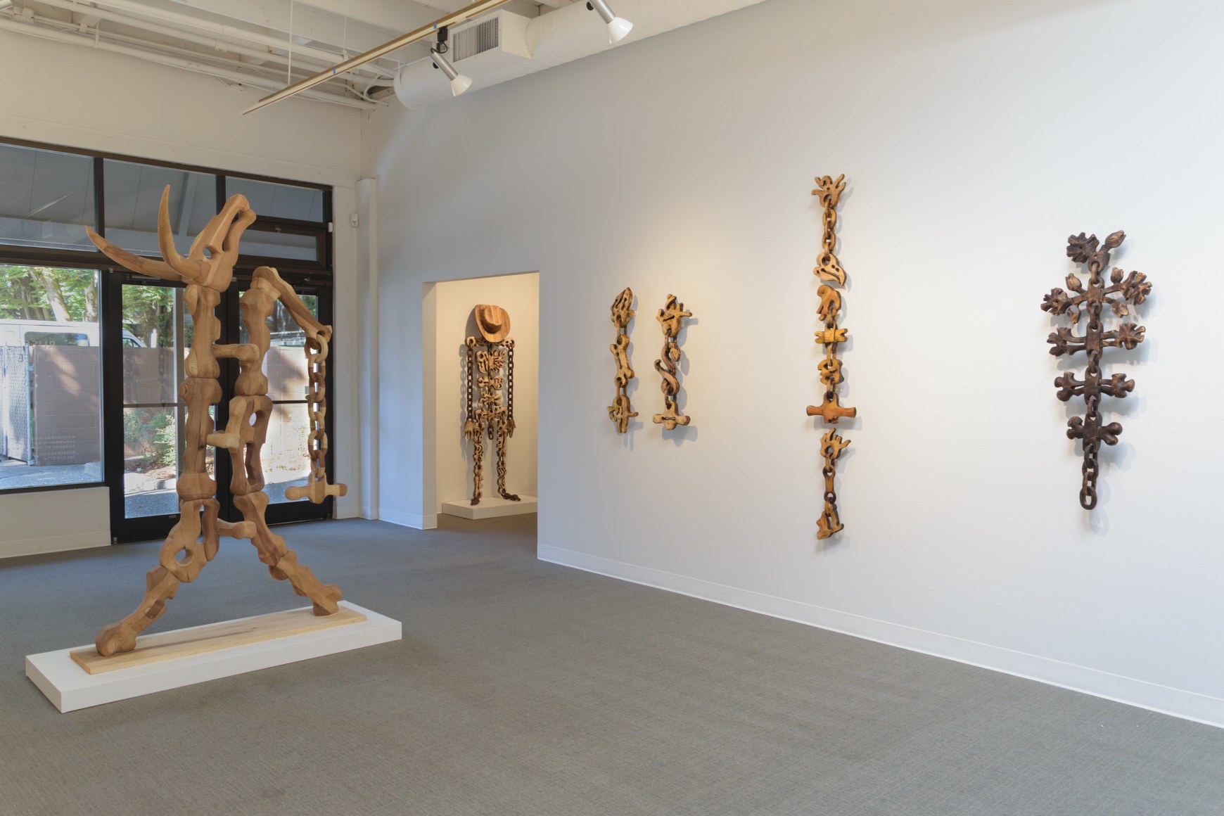 For the month of October, Russo Lee Gallery presents The West Yet Glimmers by J.D. Perkin. This sculptural installation reimagines the American West through a dystopian, mythic lens. Originally conceived during the pandemic amid wildfires and political unrest, this body of work expands on Perkin’s earlier stop-motion project Western Edge, shifting from small-scale puppet satire to large wooden assemblages. Drawing on the narrative arc of a road trip and the ‘hero’s journey,’ the artist gathers his imagined findings—wood-carved bones, tools, skulls, and chains—and assembles them into sculpture. Tree-shaped, anthropomorphic pieces recall the Pacific Coast and Sitka forests, while other forms mimic dust devils and frontier ghosts. Blending Greek myth with cowboy archetypes, Perkin states that at its heart, this show, “creates an American Neo-Gothic Dystopic Western in the form of an art installation.”