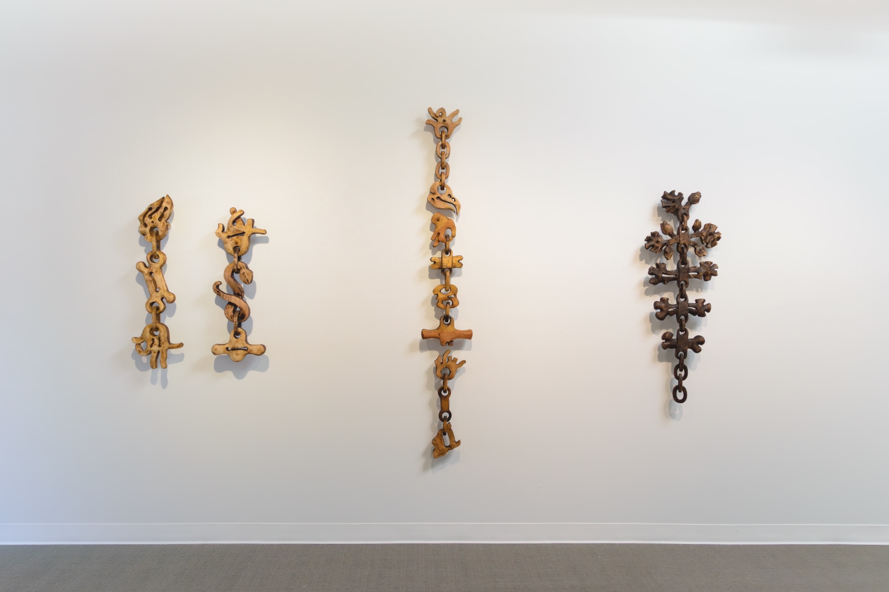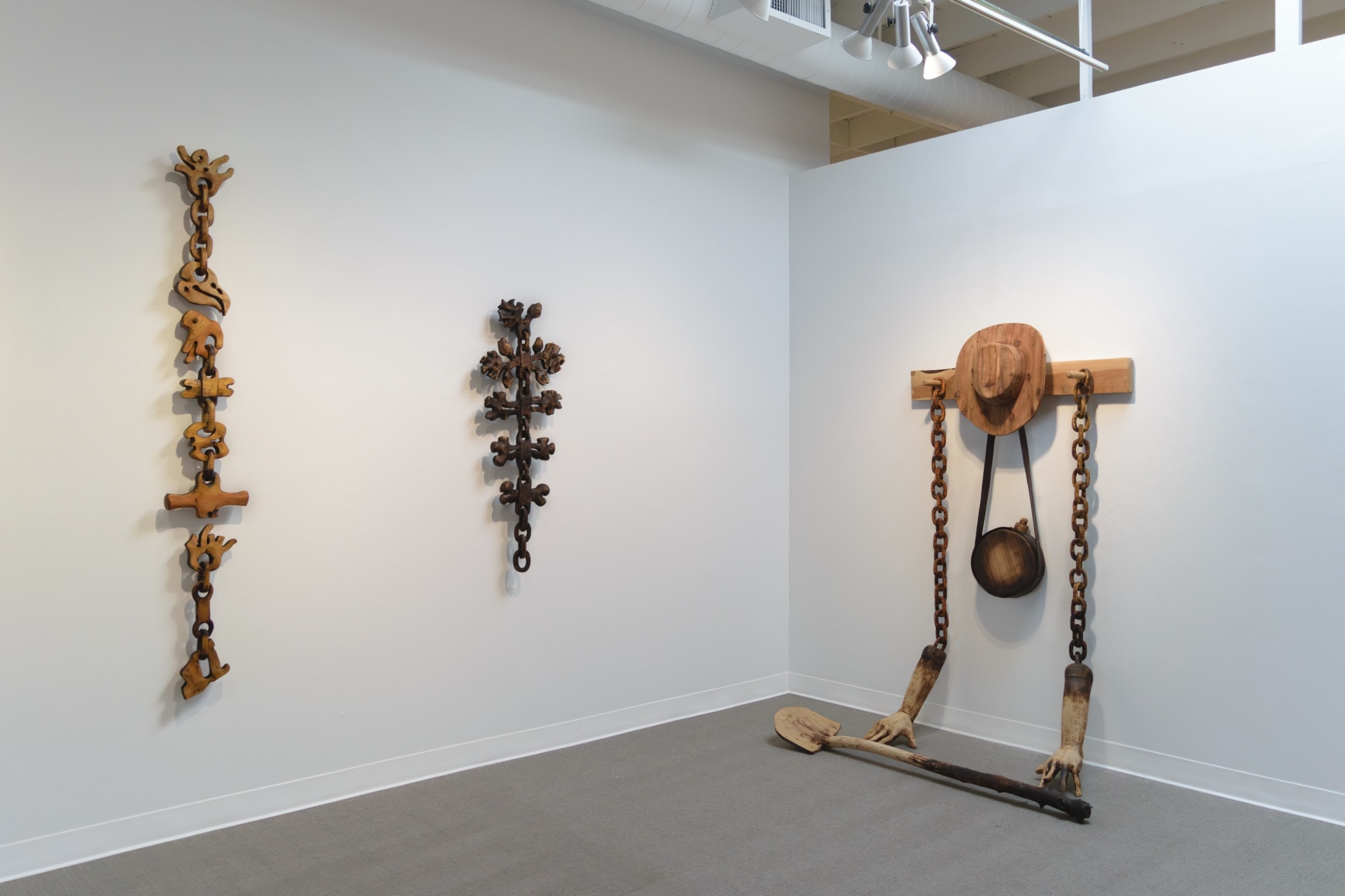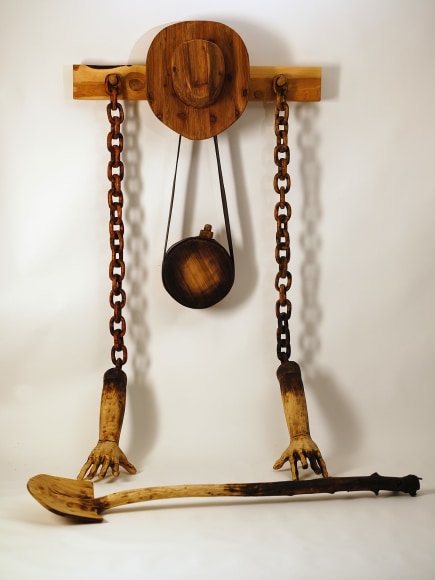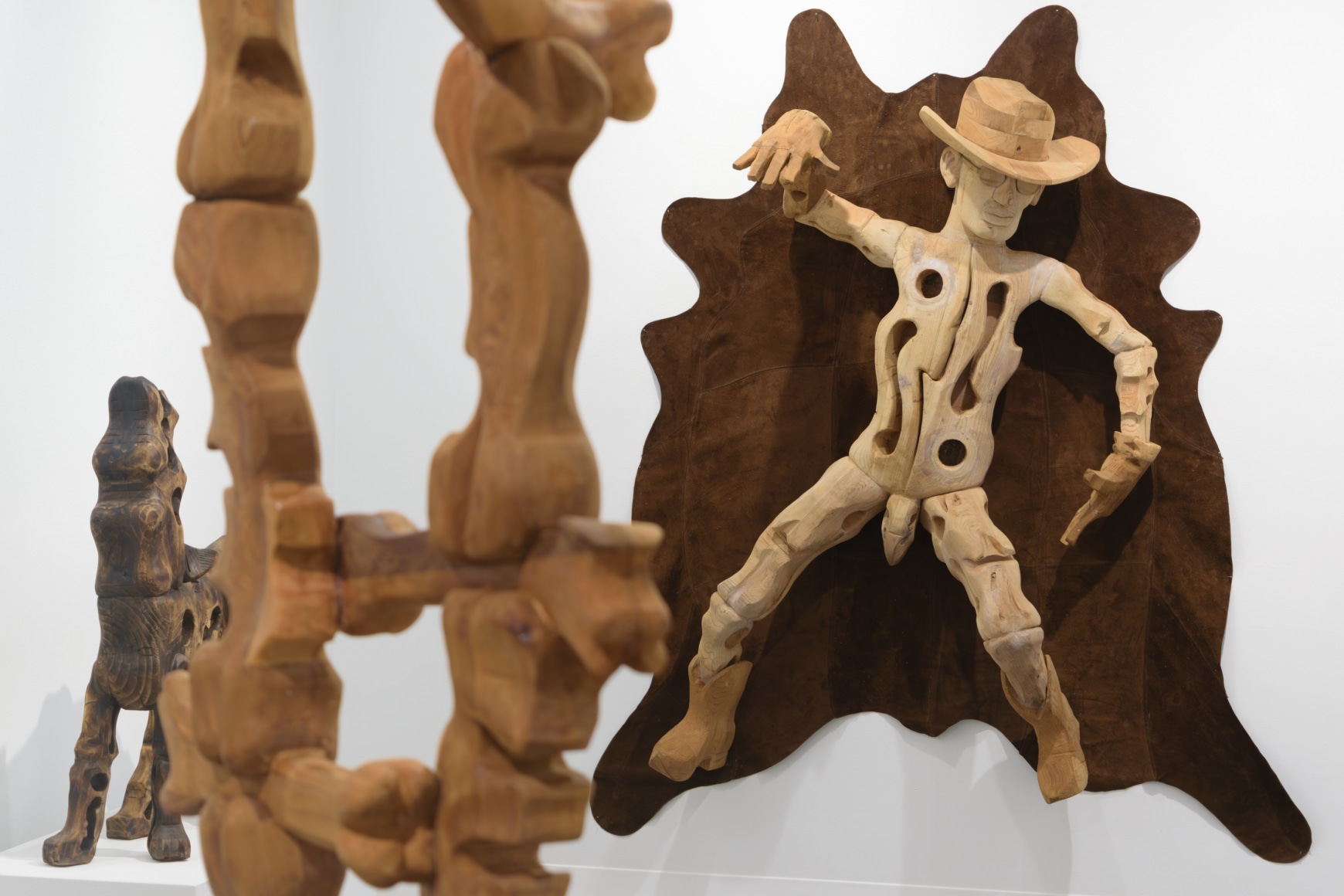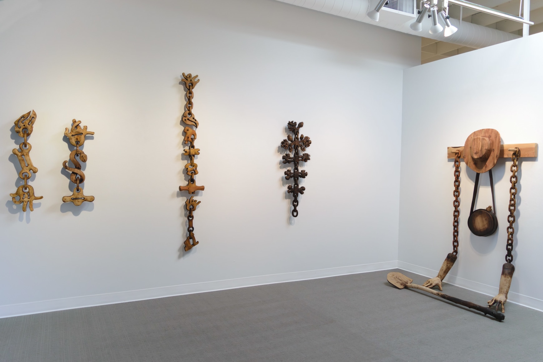 For the month of October, Russo Lee Gallery presents The West Yet Glimmers by J.D. Perkin. This sculptural installation reimagines the American West through a dystopian, mythic lens. Originally conceived during the pandemic amid wildfires and political unrest, this body of work expands on Perkin’s earlier stop-motion project Western Edge, shifting from small-scale puppet satire to large wooden assemblages. Drawing on the narrative arc of a road trip and the ‘hero’s journey,’ the artist gathers his imagined findings—wood-carved bones, tools, skulls, and chains—and assembles them into sculpture. Tree-shaped, anthropomorphic pieces recall the Pacific Coast and Sitka forests, while other forms mimic dust devils and frontier ghosts. Blending Greek myth with cowboy archetypes, Perkin states that at its heart, this show, “creates an American Neo-Gothic Dystopic Western in the form of an art installation.”