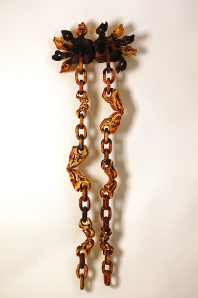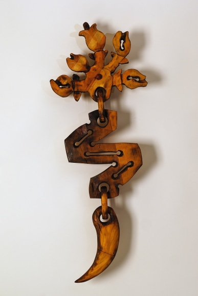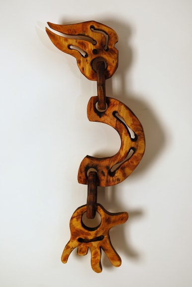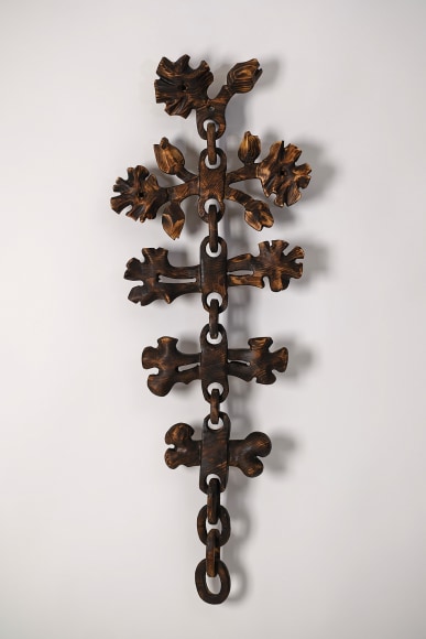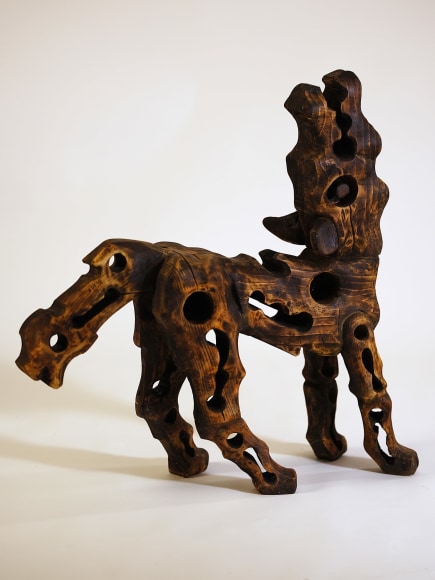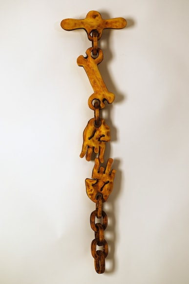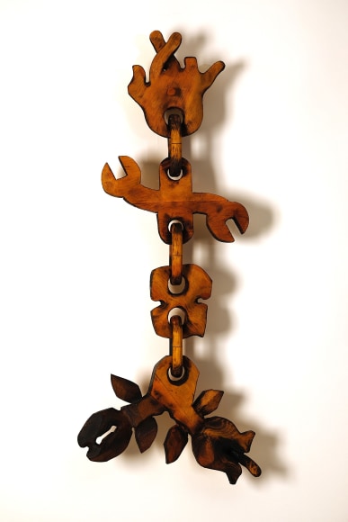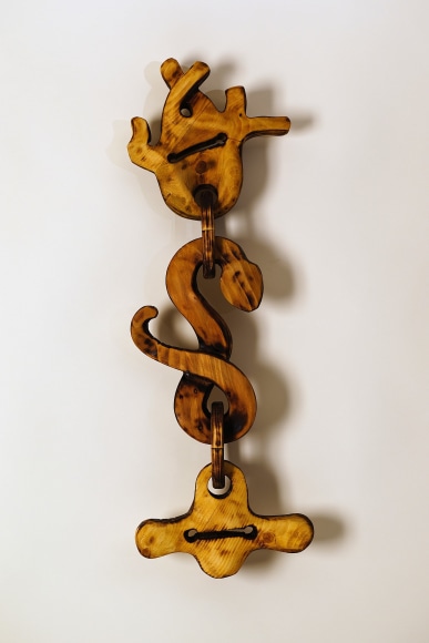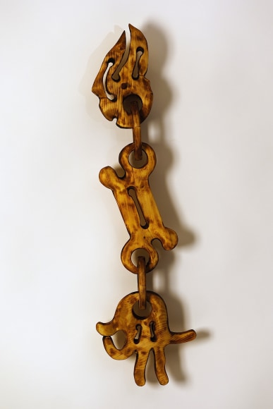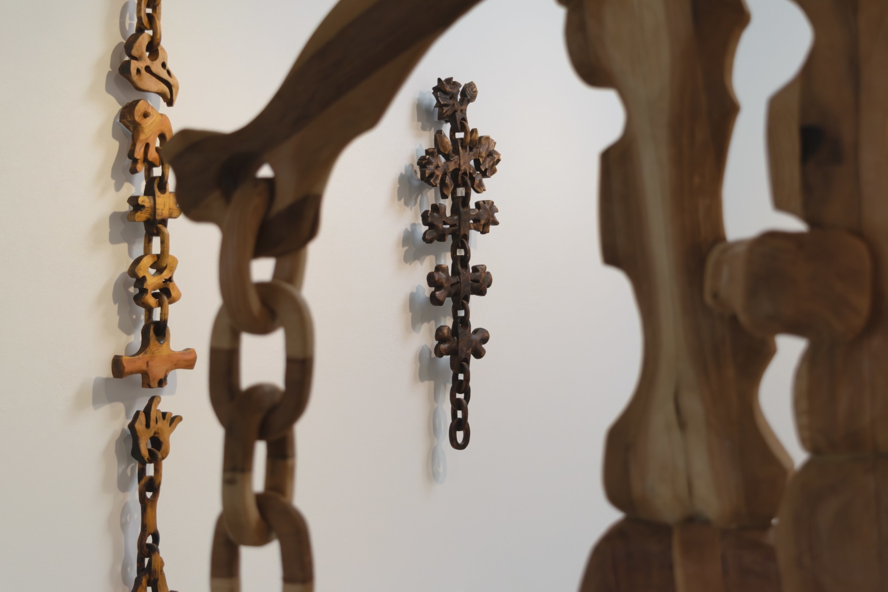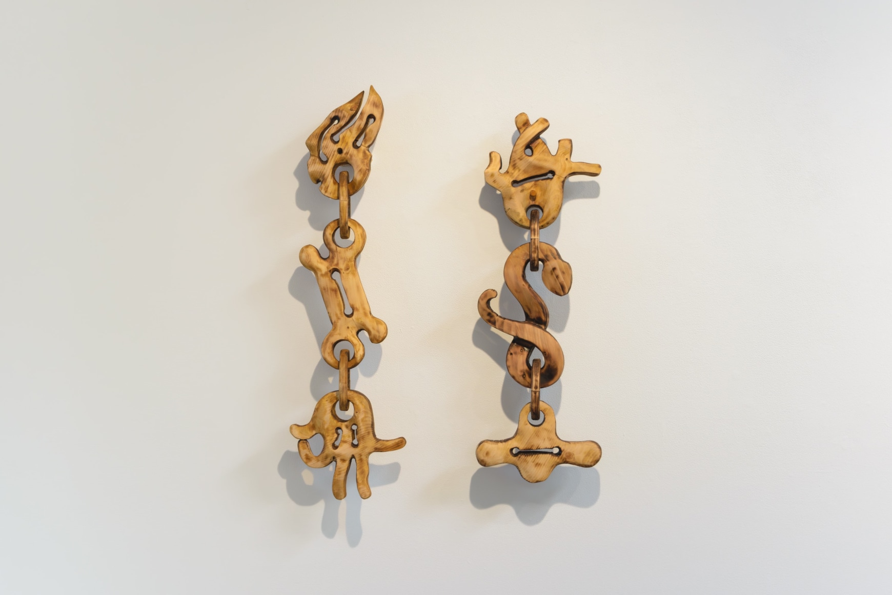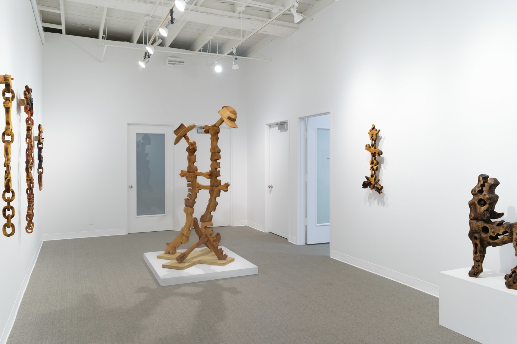 For the month of October, Russo Lee Gallery presents The West Yet Glimmers by J.D. Perkin. This sculptural installation reimagines the American West through a dystopian, mythic lens. Originally conceived during the pandemic amid wildfires and political unrest, this body of work expands on Perkin’s earlier stop-motion project Western Edge, shifting from small-scale puppet satire to large wooden assemblages. Drawing on the narrative arc of a road trip and the ‘hero’s journey,’ the artist gathers his imagined findings—wood-carved bones, tools, skulls, and chains—and assembles them into sculpture. Tree-shaped, anthropomorphic pieces recall the Pacific Coast and Sitka forests, while other forms mimic dust devils and frontier ghosts. Blending Greek myth with cowboy archetypes, Perkin states that at its heart, this show, “creates an American Neo-Gothic Dystopic Western in the form of an art installation.”