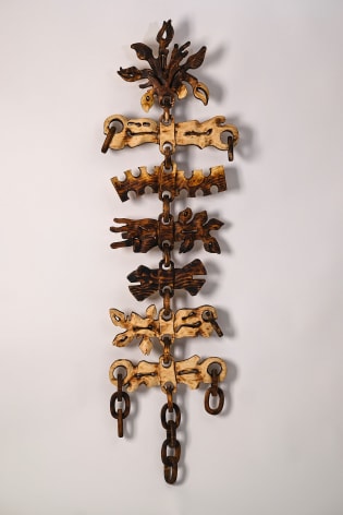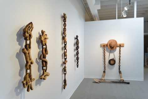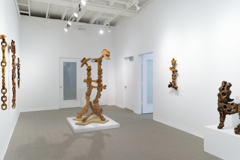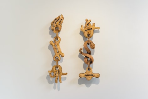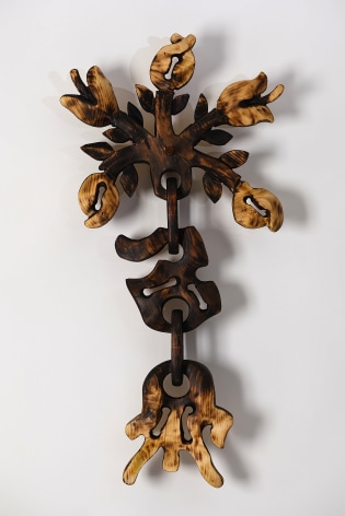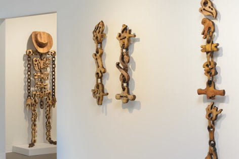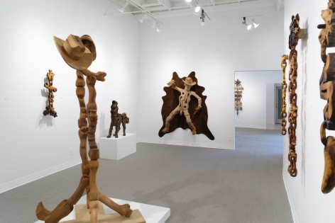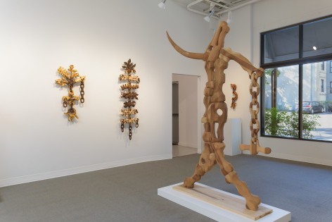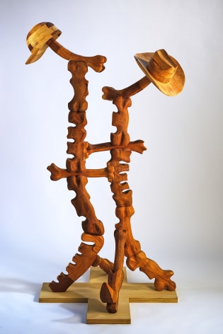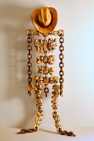 For the month of October, Russo Lee Gallery presents The West Yet Glimmers by J.D. Perkin. This sculptural installation reimagines the American West through a dystopian, mythic lens. Originally conceived during the pandemic amid wildfires and political unrest, this body of work expands on Perkin’s earlier stop-motion project Western Edge, shifting from small-scale puppet satire to large wooden assemblages. Drawing on the narrative arc of a road trip and the ‘hero’s journey,’ the artist gathers his imagined findings—wood-carved bones, tools, skulls, and chains—and assembles them into sculpture. Tree-shaped, anthropomorphic pieces recall the Pacific Coast and Sitka forests, while other forms mimic dust devils and frontier ghosts. Blending Greek myth with cowboy archetypes, Perkin states that at its heart, this show, “creates an American Neo-Gothic Dystopic Western in the form of an art installation.”