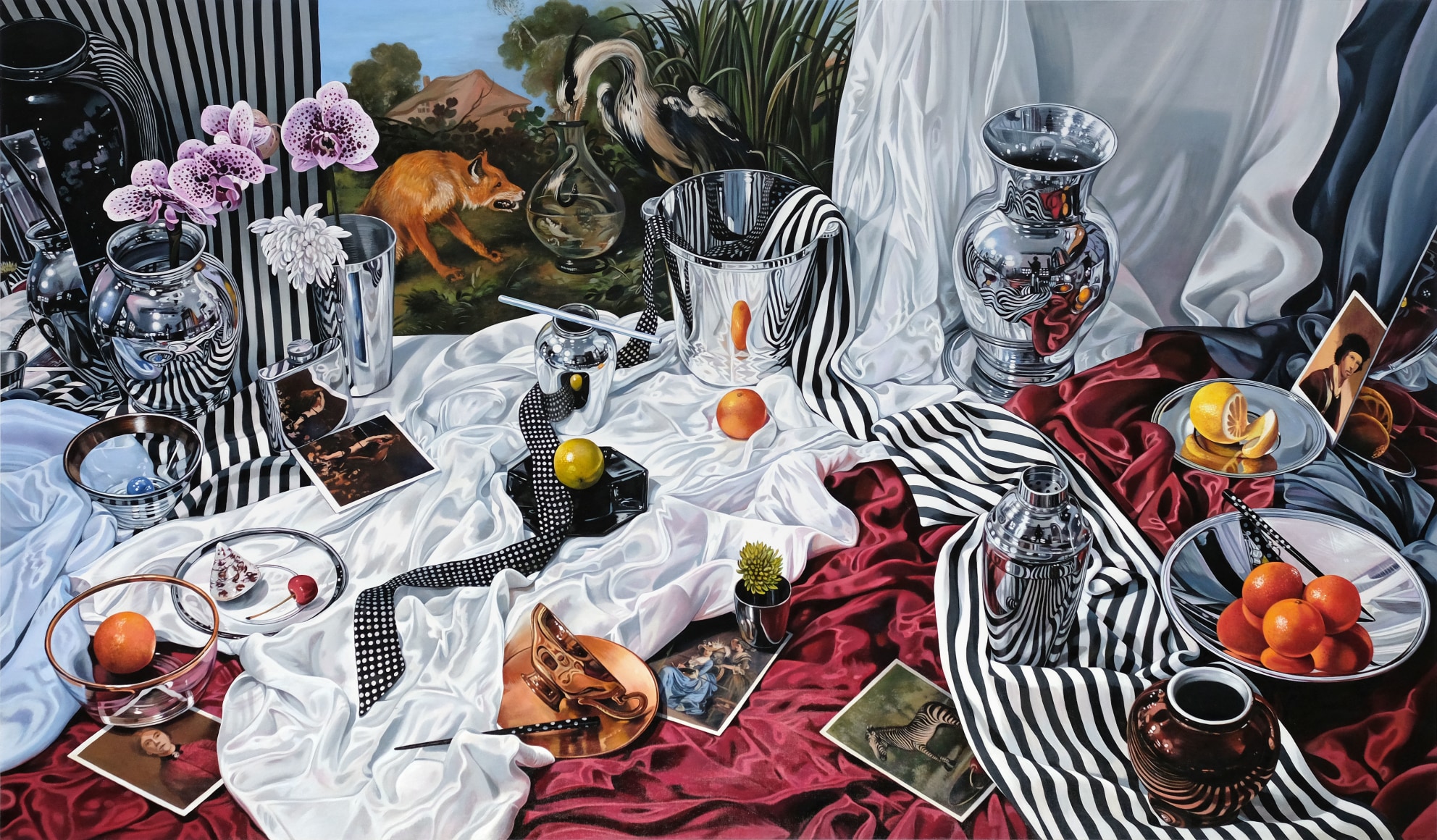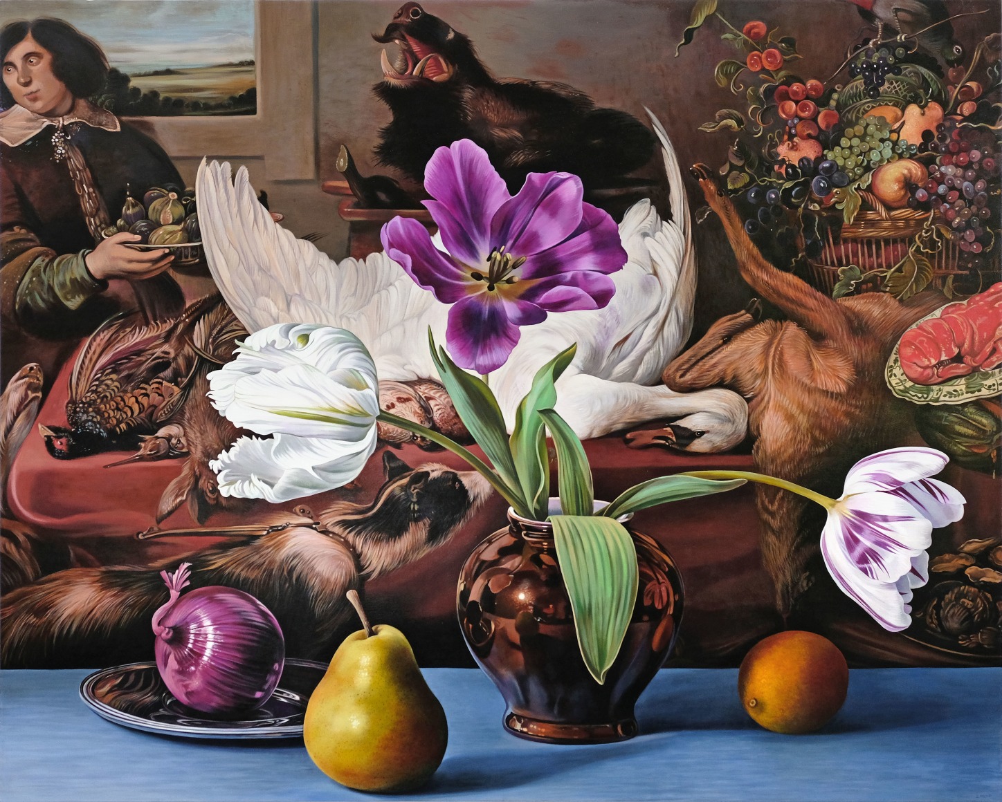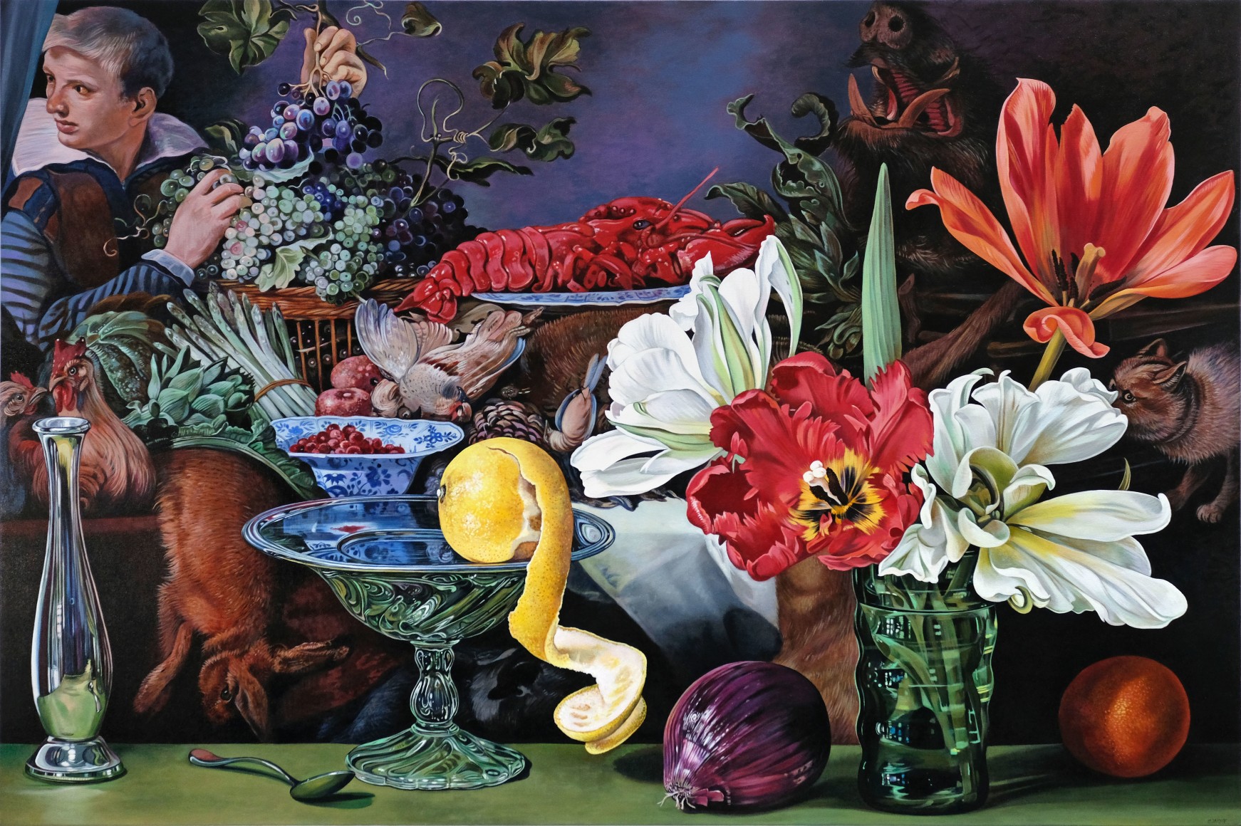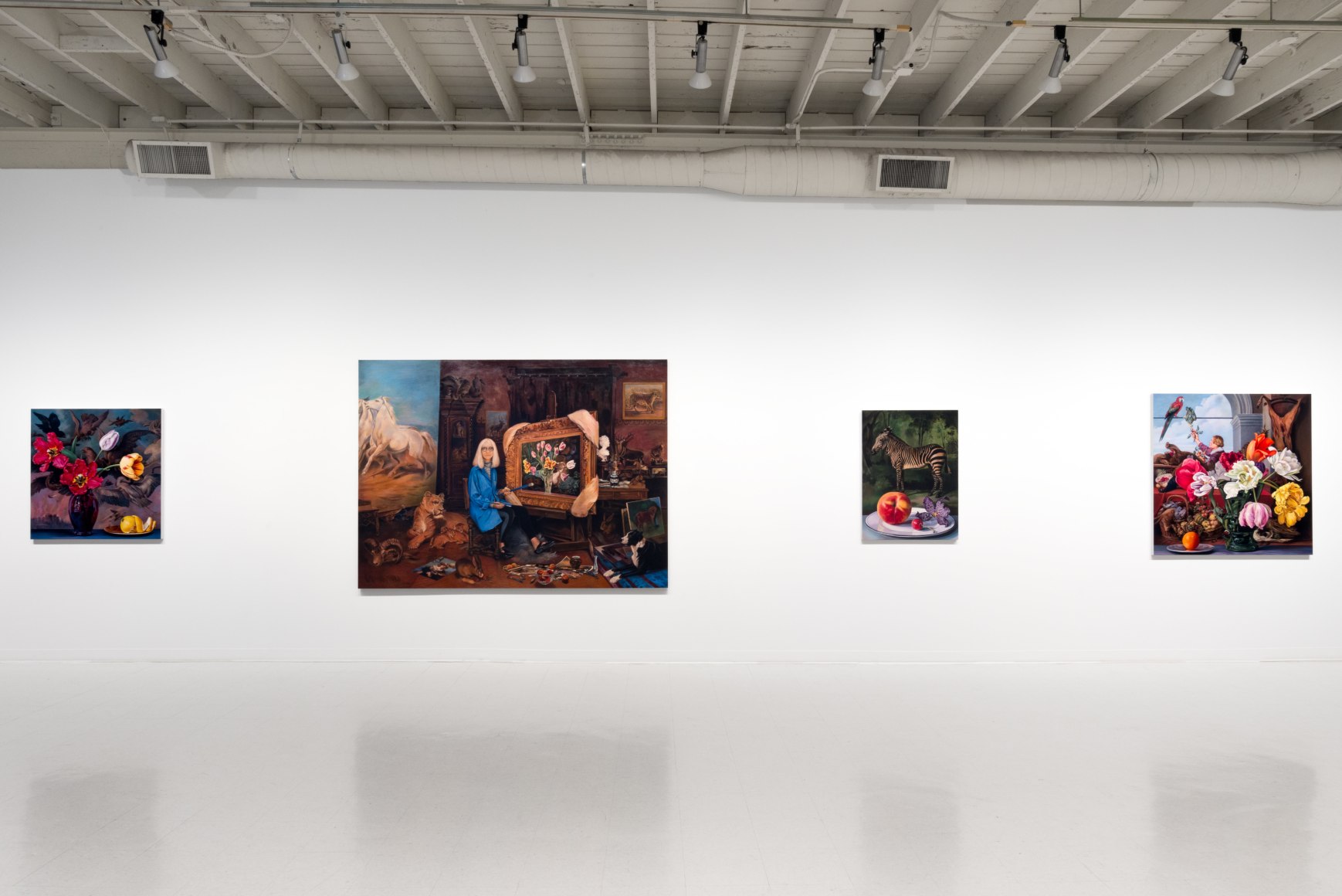 Russo Lee Gallery is pleased to present Animaliére by Sherrie Wolf. This exhibition began as a tribute to Rosa Bonheur’s career as the preeminent 19th century painter of animals. In Wolf’s large-scale work titled “Self-Portrait in Rosa Bonheur’s Studio”, she has shown herself in Bonheur’s Paris studio, using as reference a portrait of Bonheur by George Achille-Fould. Along with Wolf’s exploration of self-portraiture, throughout her practice she has juxtaposed realistic still-life objects interacting with a variety of significant references from art history. This body of work continues the theme by incorporating historic animal paintings within the backgrounds. Wolf’s skillful use of reflected and refracted light creates works that are charged with color and rich in detail.