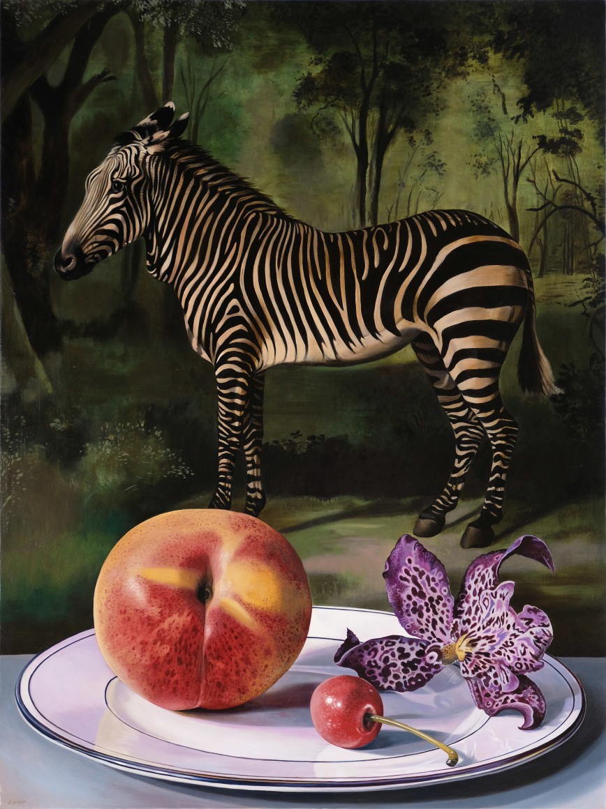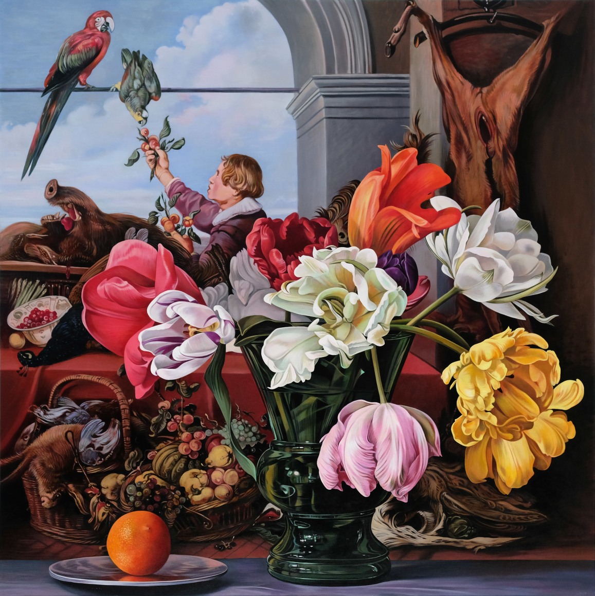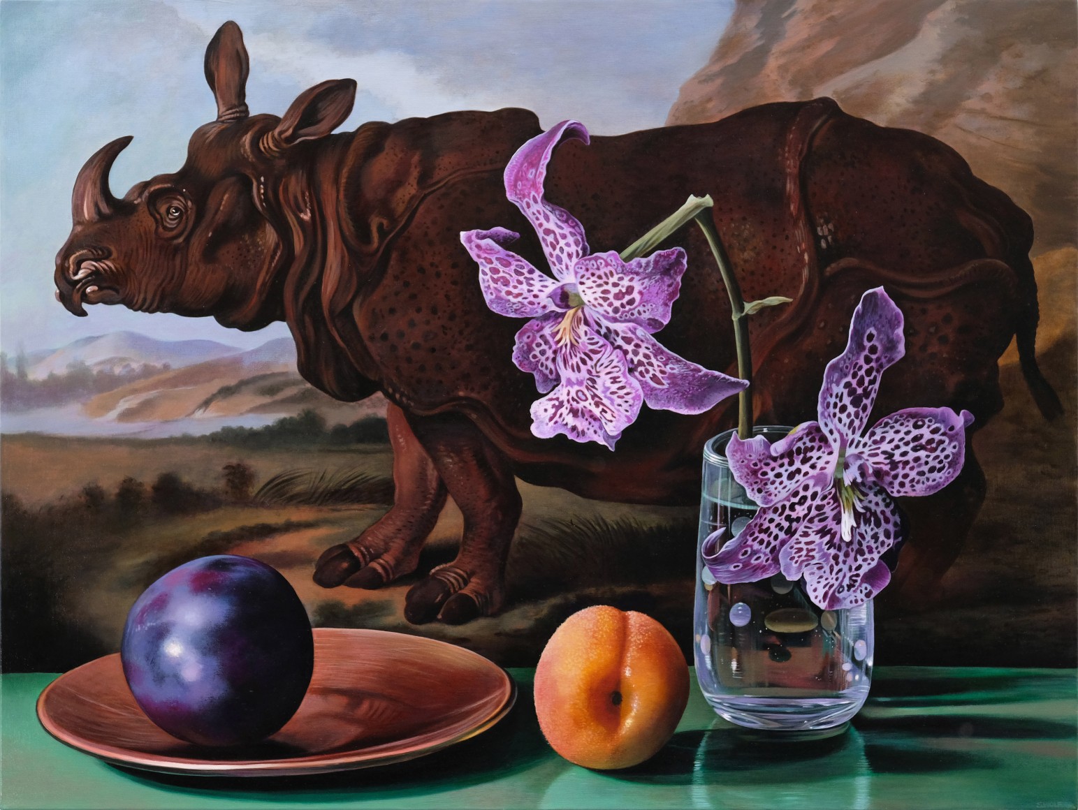 Russo Lee Gallery is pleased to present Animaliére by Sherrie Wolf. This exhibition began as a tribute to Rosa Bonheur’s career as the preeminent 19th century painter of animals. In Wolf’s large-scale work titled “Self-Portrait in Rosa Bonheur’s Studio”, she has shown herself in Bonheur’s Paris studio, using as reference a portrait of Bonheur by George Achille-Fould. Along with Wolf’s exploration of self-portraiture, throughout her practice she has juxtaposed realistic still-life objects interacting with a variety of significant references from art history. This body of work continues the theme by incorporating historic animal paintings within the backgrounds. Wolf’s skillful use of reflected and refracted light creates works that are charged with color and rich in detail.