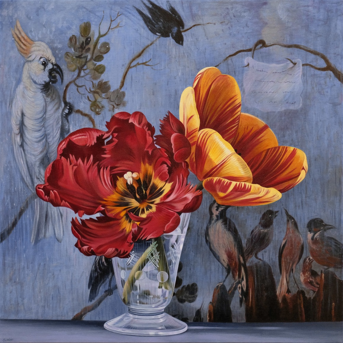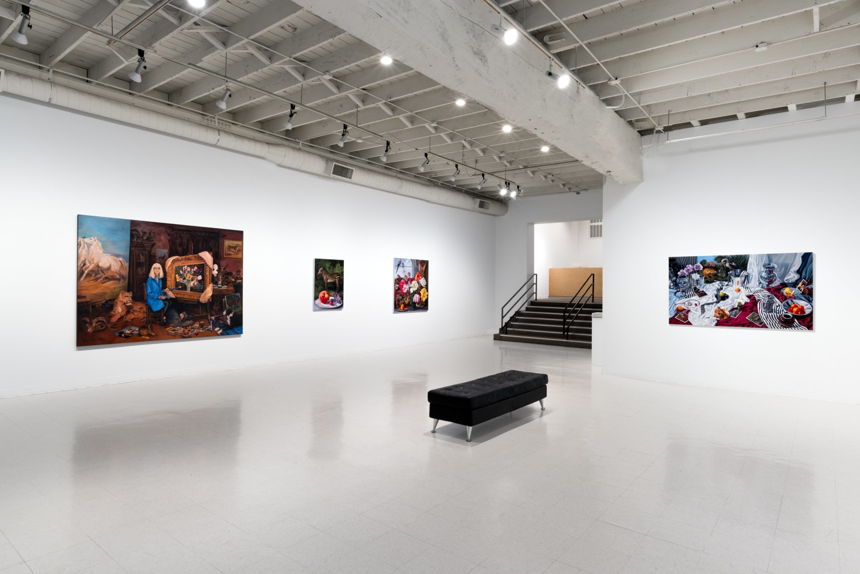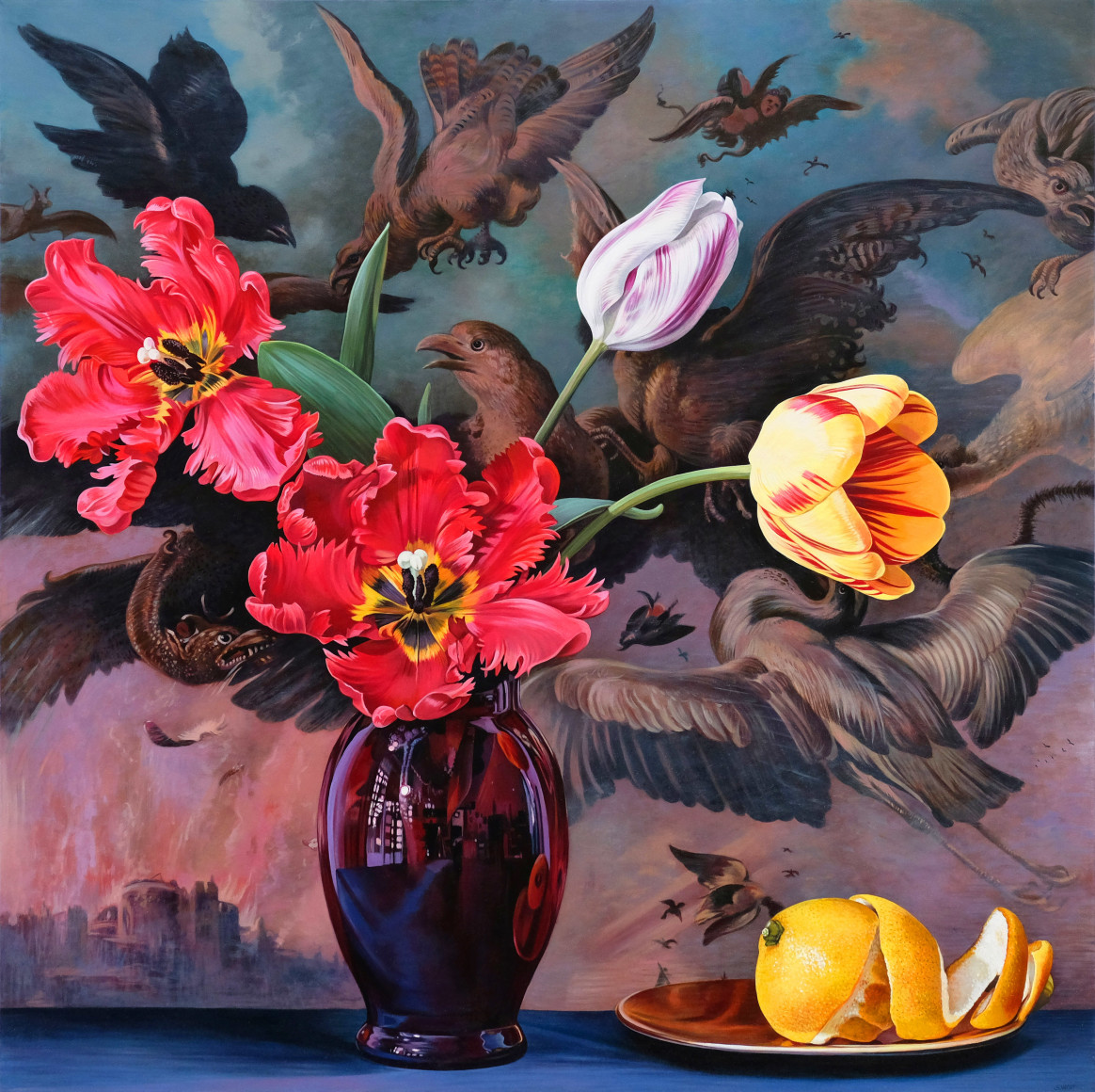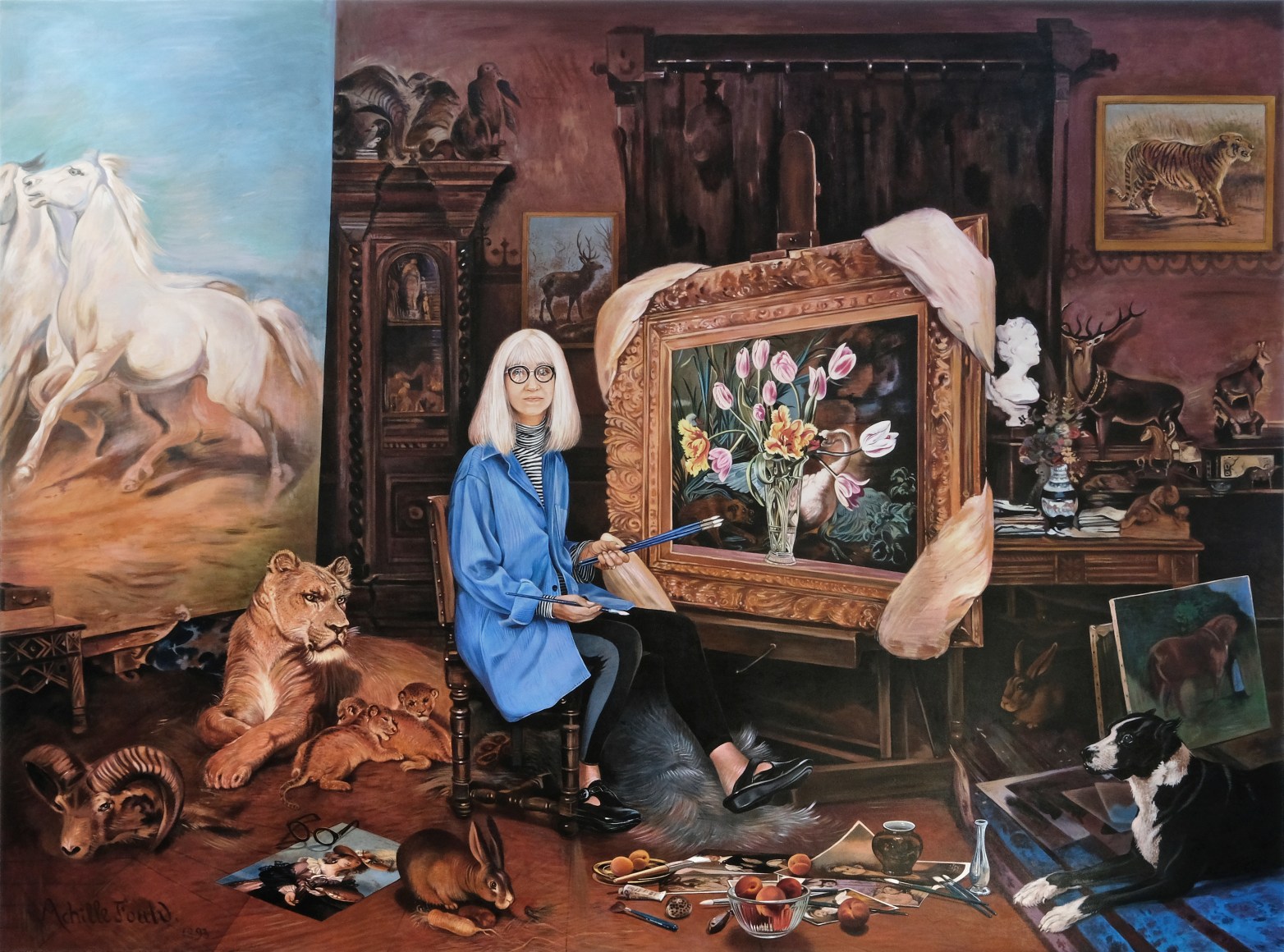 Russo Lee Gallery is pleased to present Animaliére by Sherrie Wolf. This exhibition began as a tribute to Rosa Bonheur’s career as the preeminent 19th century painter of animals. In Wolf’s large-scale work titled “Self-Portrait in Rosa Bonheur’s Studio”, she has shown herself in Bonheur’s Paris studio, using as reference a portrait of Bonheur by George Achille-Fould. Along with Wolf’s exploration of self-portraiture, throughout her practice she has juxtaposed realistic still-life objects interacting with a variety of significant references from art history. This body of work continues the theme by incorporating historic animal paintings within the backgrounds. Wolf’s skillful use of reflected and refracted light creates works that are charged with color and rich in detail.