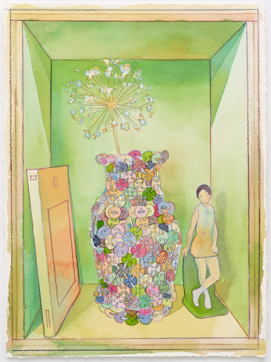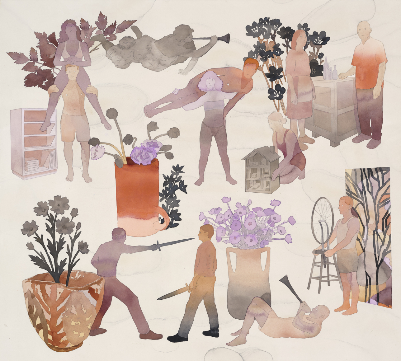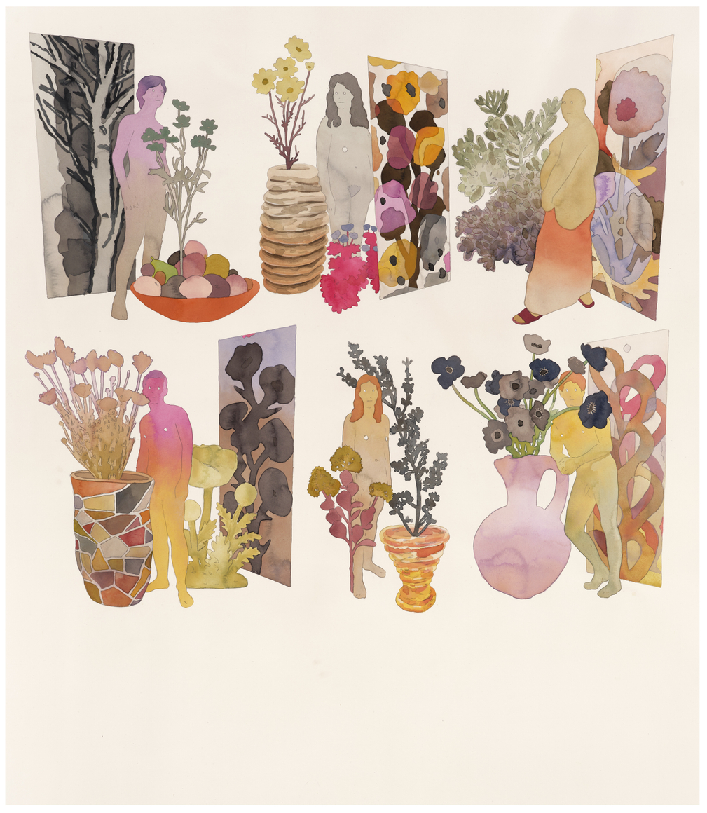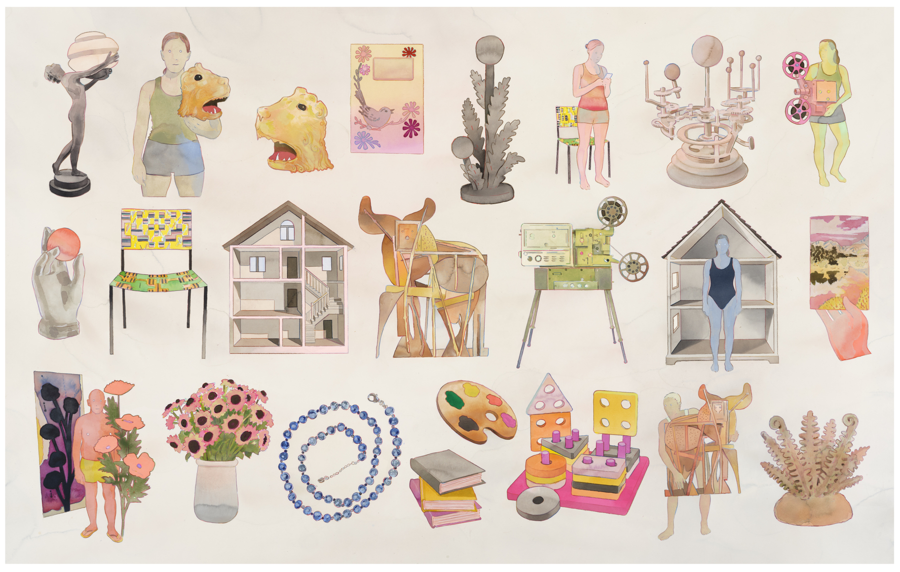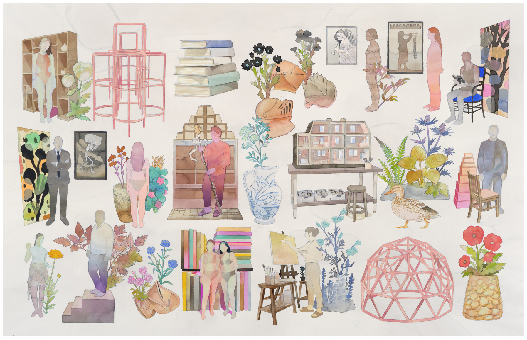 Russo Lee Gallery is pleased to present 𝘛𝘩𝘦 𝘕𝘦𝘪𝘨𝘩𝘣𝘰𝘳𝘪𝘯𝘨 𝘞𝘰𝘳𝘭𝘥 by Dan Gluibizzi. This exhibition brings together large-scale paintings on paper and free-standing two-sided sculpture paintings that draw from the vast reservoir of contemporary visual culture, including found photographs, digital clip art, and drawings of everyday objects. Gluibizzi's process is one of patient accumulation, images are gathered and tended over time, forming a visual ecology where meaning emerges through proximity and care. Still life and the figure serve as recurring frameworks, while ancient myth, personal memory, and everyday imagery converge in the same pictorial territory. The result is a body of work that feels simultaneously familiar and dreamlike, where stylized flowers, humble objects, and the human form inhabit a neighboring world that is not something remote or imagined, but something already present in the images and objects that surround us.