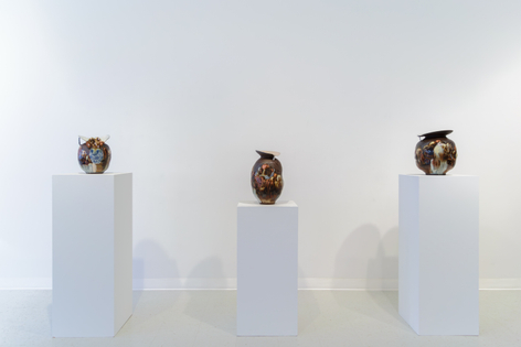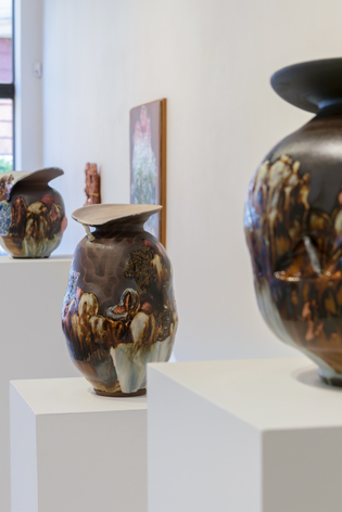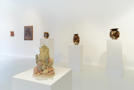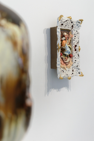 Russo Lee Gallery is pleased to present Magnificent Malaise by invited artist Dirk Staschke. For the past eighteen years, Staschke’s practice has explored the space between painting and sculpture, producing works that include sculptures of paintings, vases, and ceramic paintings. Best known for his shadowbox sculptures that juxtapose virtuosic illusion with visibly rough construction, his earlier works function as observations on control and perception. This exhibition marks a shift toward a more formal investigation of beauty and a reflection of the artist’s own worldview. Drawing on the tradition of Vanitas still life painting—with its symbolism of transience, futility, and mortality—the current work seeks to transform this grim legacy into something more positive. Staschke describes his process as a construction of smaller pieces that form a larger whole. Lush ceramic surfaces soften foreboding forms, employing a transgressive beauty that finds elegance within the seemingly disturbing.