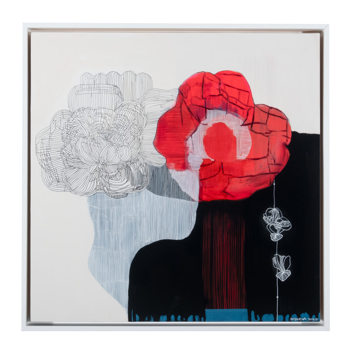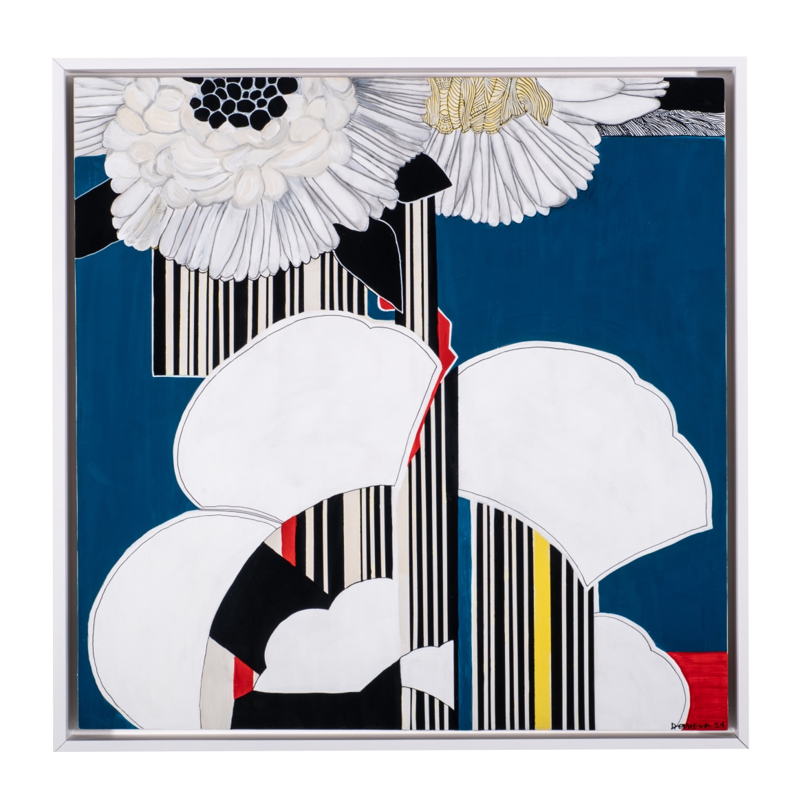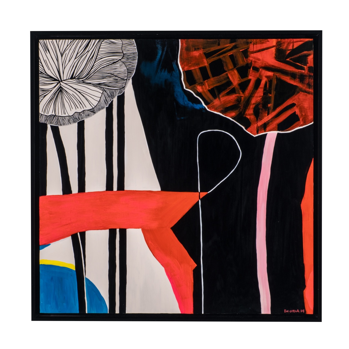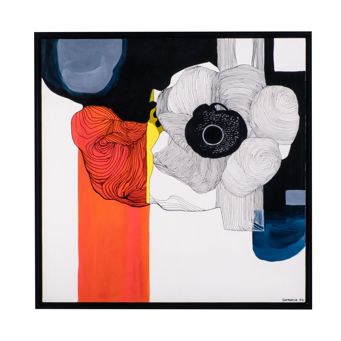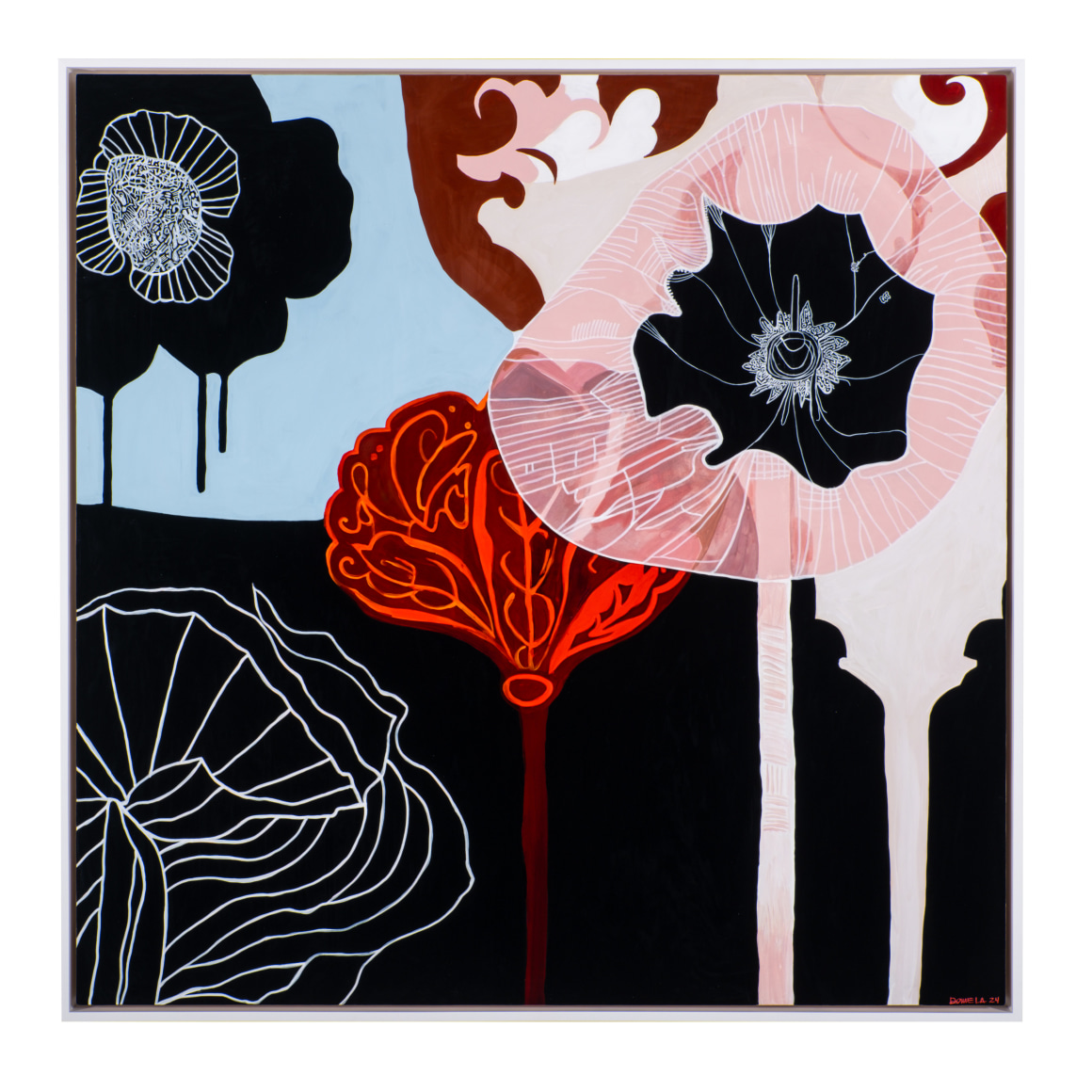 For the month of May, Russo Lee presents Defense Mechanisms by Laura Domela. For this compelling exhibition, Domela explores the complex ways we navigate fear. Visually, the paintings are a study in contrast, exploring emotional and psychological themes through the lens of contemporary abstraction. Bright, festive colors and floral motifs are layered over dark forms, stark geometries, and intricate line work, creating a dynamic push and pull between beauty and unease. Domela states, “Visually, I want my work to reflect this tension between vulnerability and protection – what we hide, how we armor ourselves.”