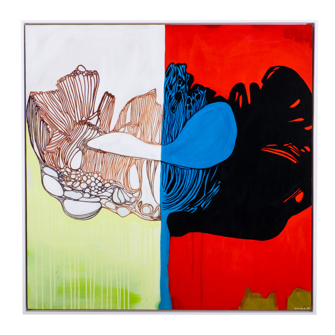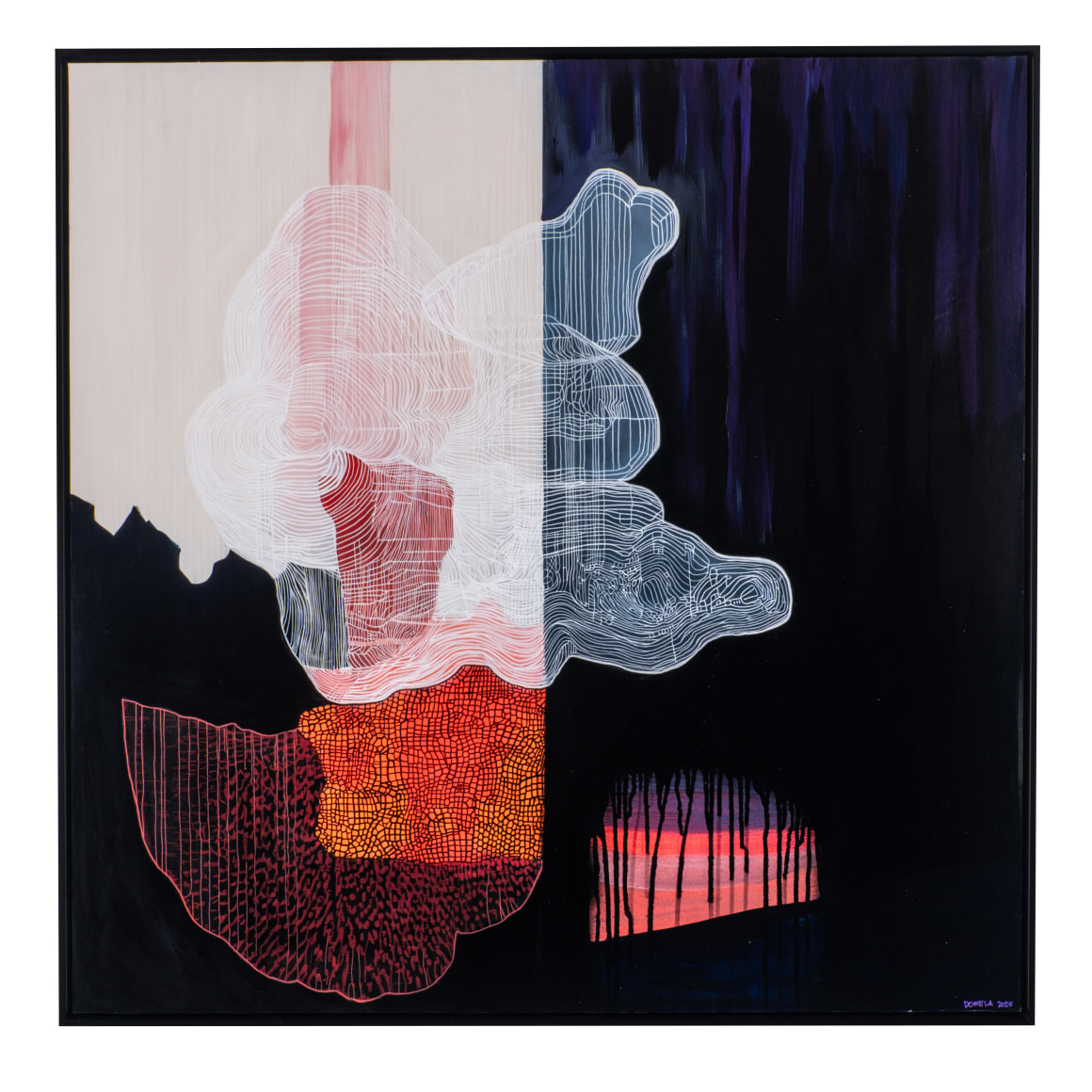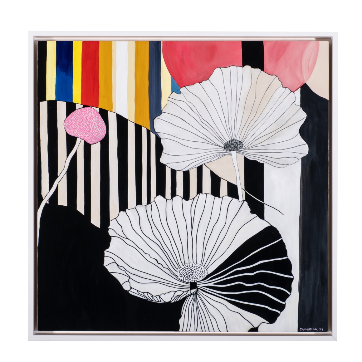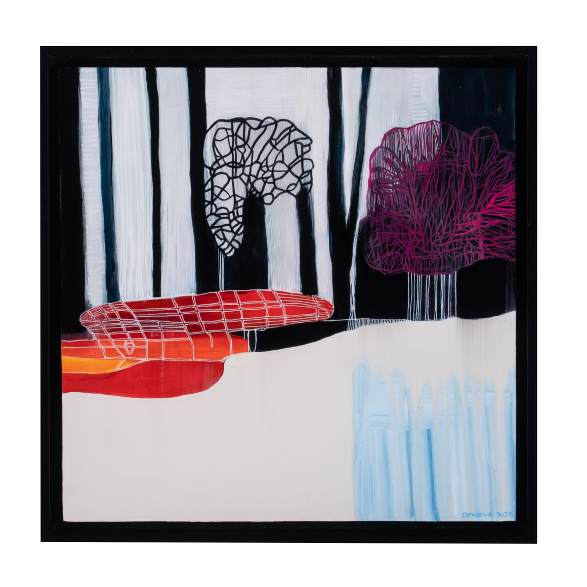 For the month of May, Russo Lee presents Defense Mechanisms by Laura Domela. For this compelling exhibition, Domela explores the complex ways we navigate fear. Visually, the paintings are a study in contrast, exploring emotional and psychological themes through the lens of contemporary abstraction. Bright, festive colors and floral motifs are layered over dark forms, stark geometries, and intricate line work, creating a dynamic push and pull between beauty and unease. Domela states, “Visually, I want my work to reflect this tension between vulnerability and protection – what we hide, how we armor ourselves.”