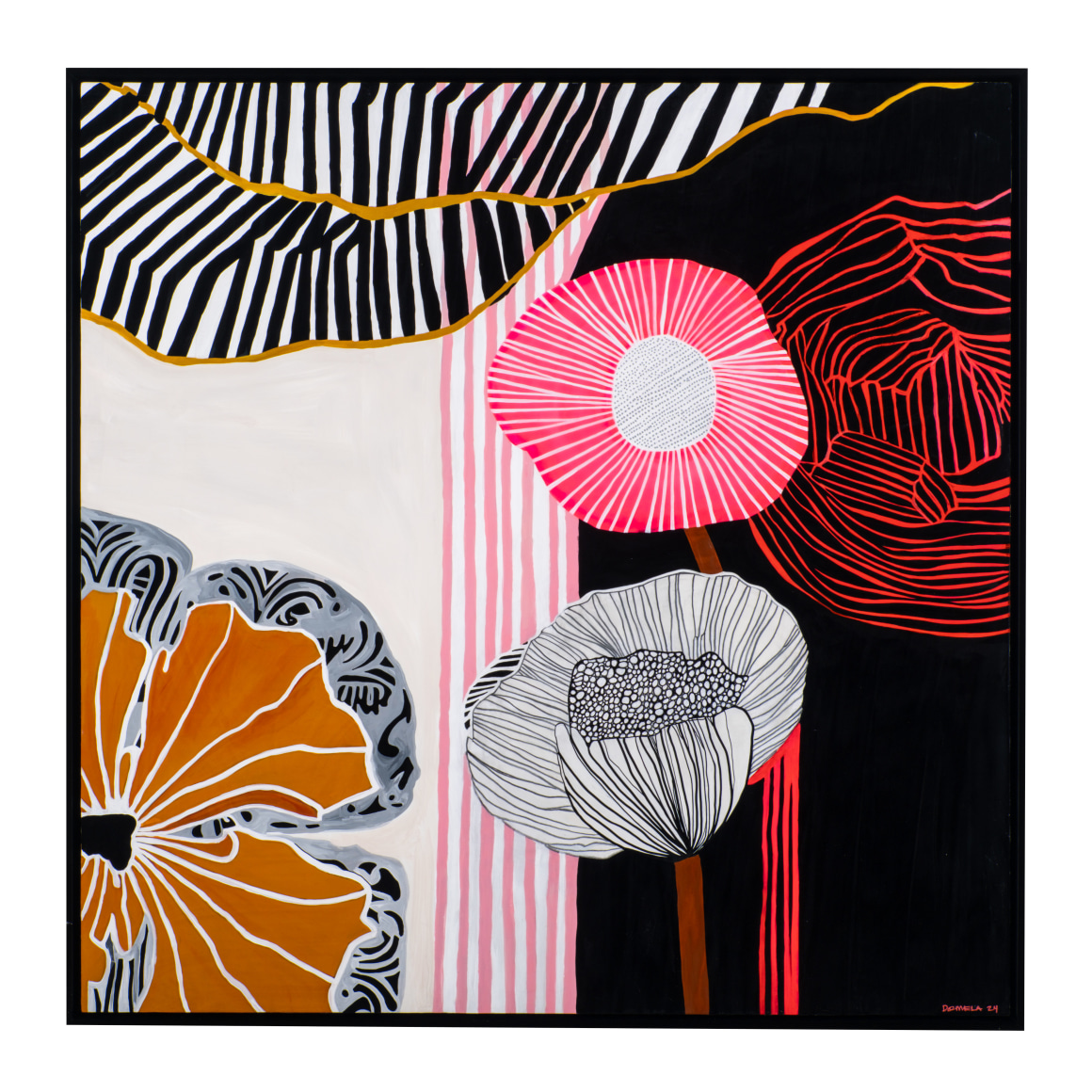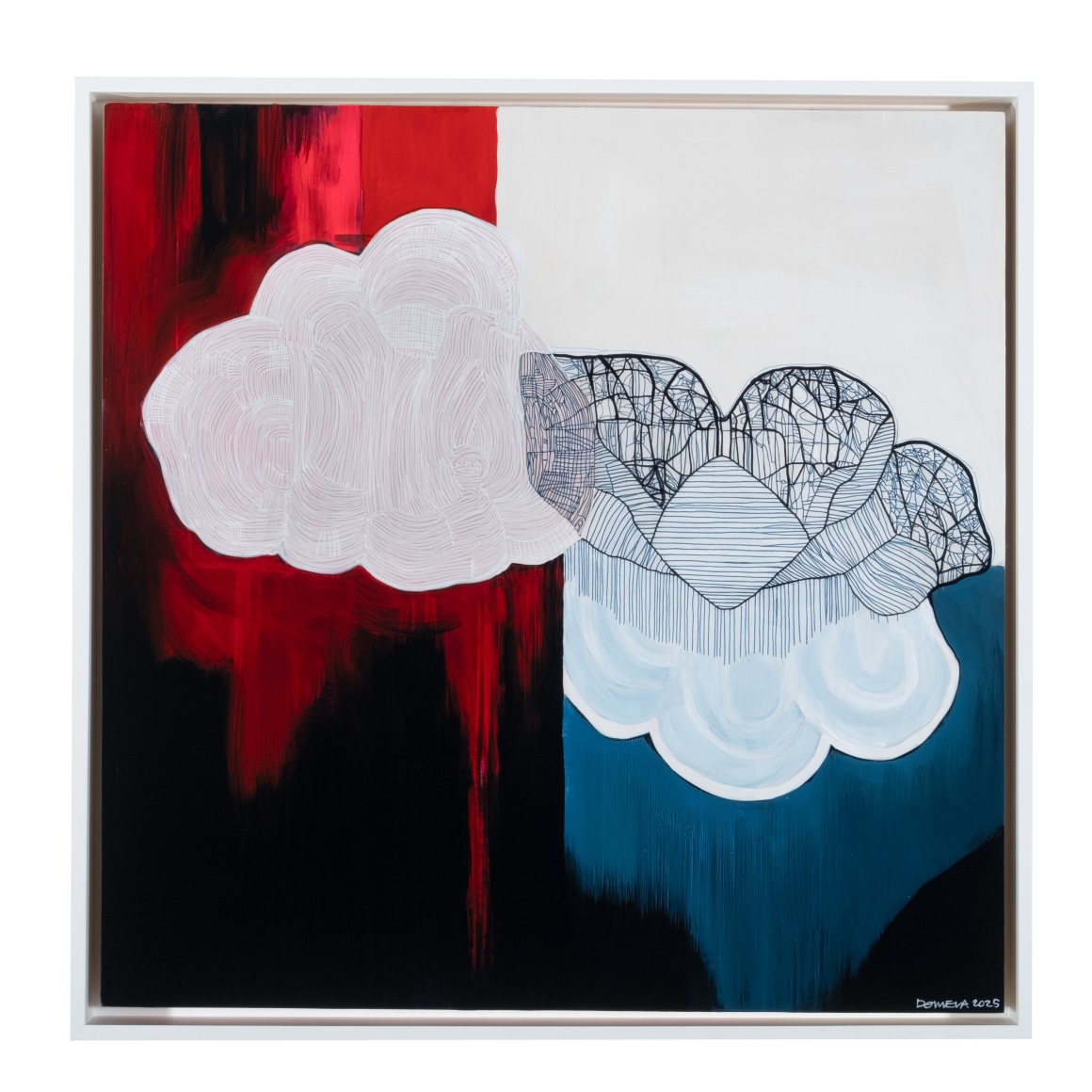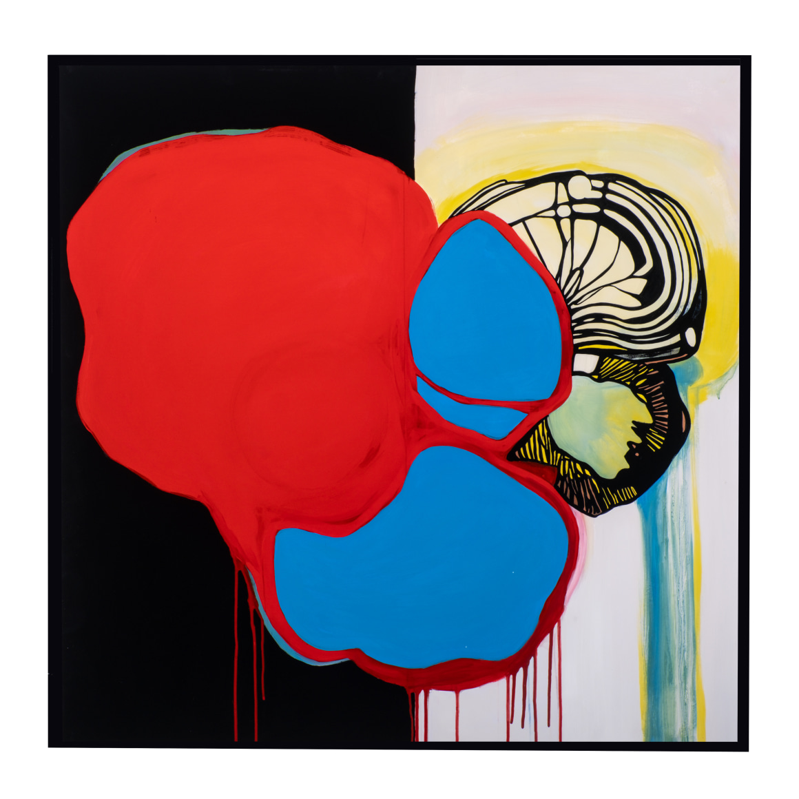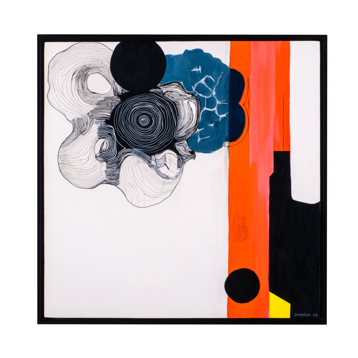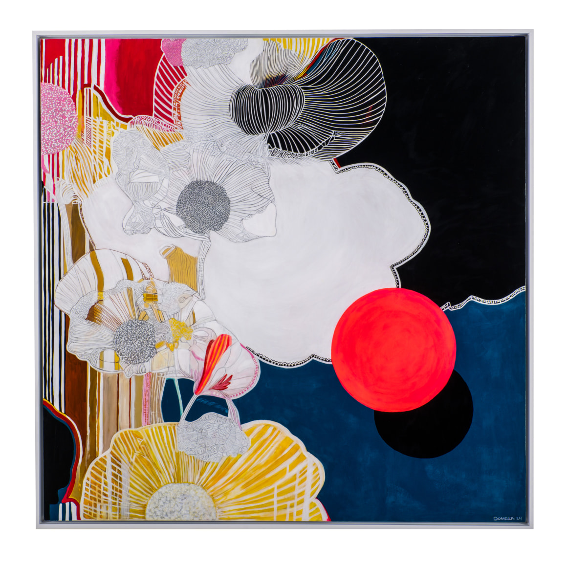 For the month of May, Russo Lee presents Defense Mechanisms by Laura Domela. For this compelling exhibition, Domela explores the complex ways we navigate fear. Visually, the paintings are a study in contrast, exploring emotional and psychological themes through the lens of contemporary abstraction. Bright, festive colors and floral motifs are layered over dark forms, stark geometries, and intricate line work, creating a dynamic push and pull between beauty and unease. Domela states, “Visually, I want my work to reflect this tension between vulnerability and protection – what we hide, how we armor ourselves.”