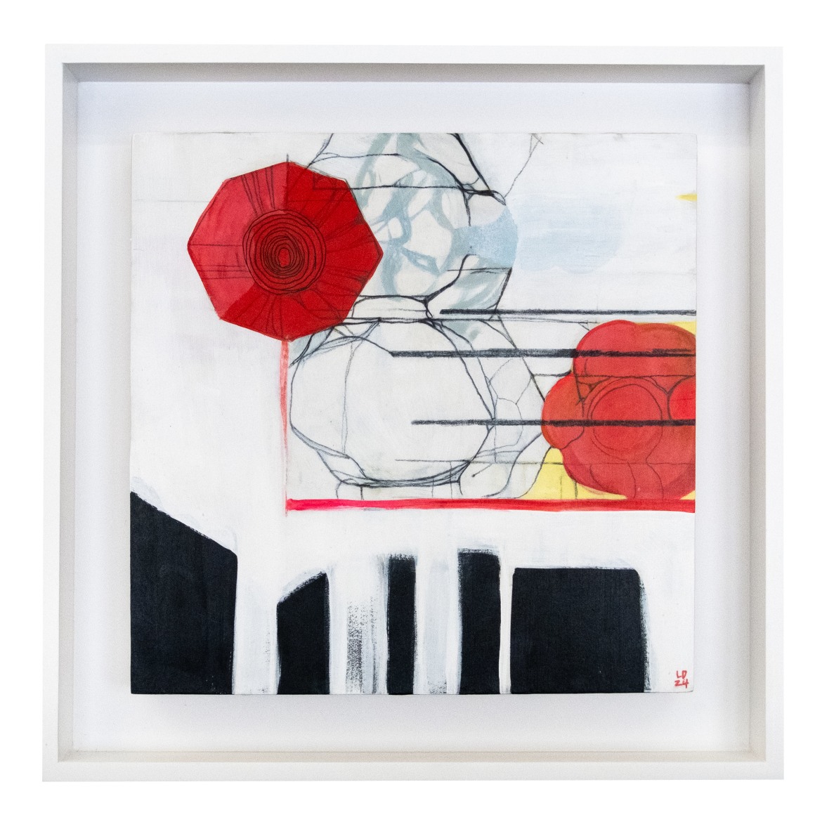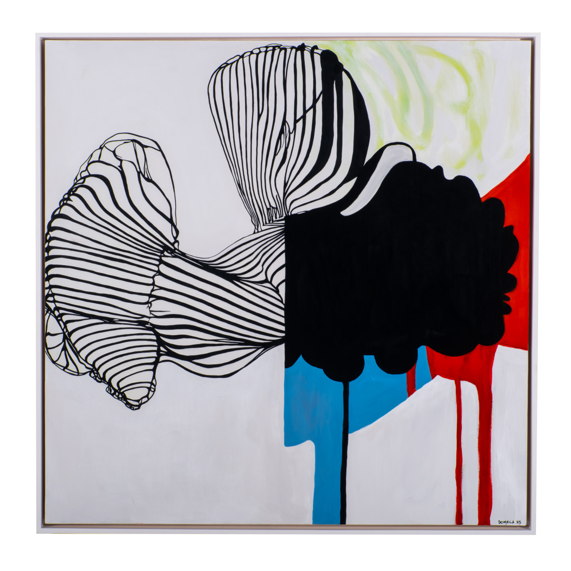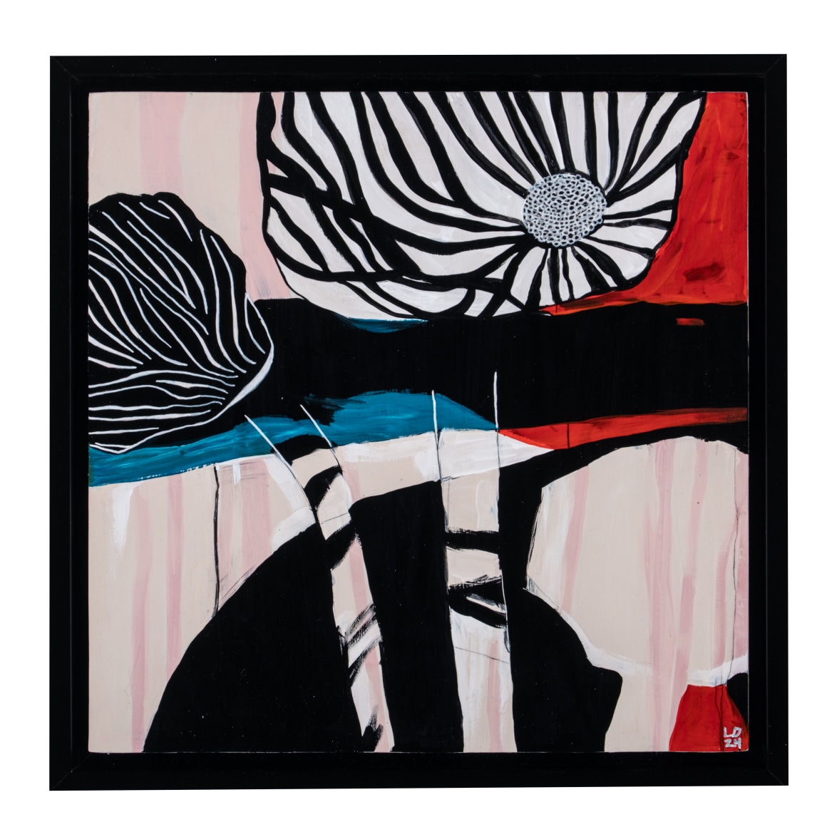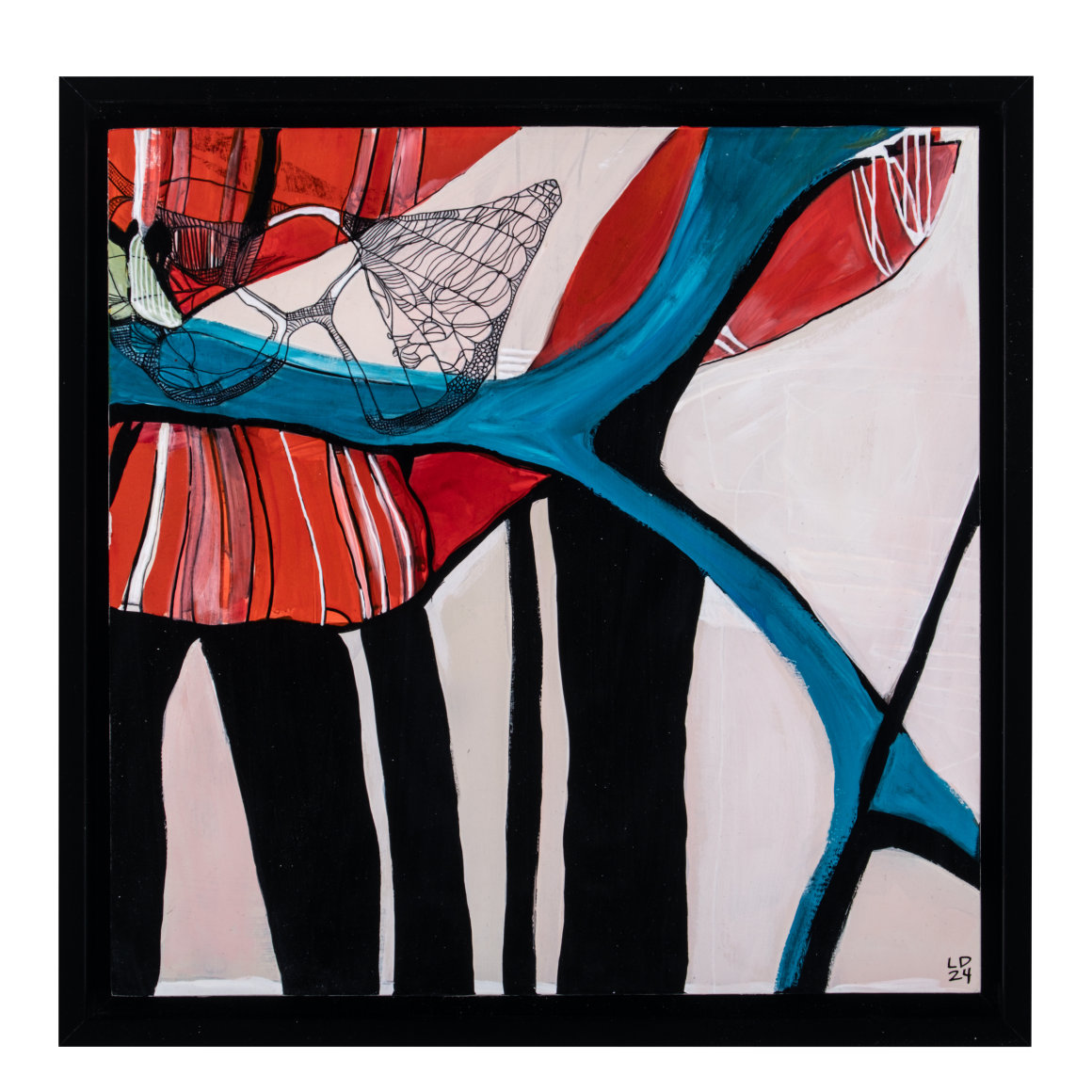 For the month of May, Russo Lee presents Defense Mechanisms by Laura Domela. For this compelling exhibition, Domela explores the complex ways we navigate fear. Visually, the paintings are a study in contrast, exploring emotional and psychological themes through the lens of contemporary abstraction. Bright, festive colors and floral motifs are layered over dark forms, stark geometries, and intricate line work, creating a dynamic push and pull between beauty and unease. Domela states, “Visually, I want my work to reflect this tension between vulnerability and protection – what we hide, how we armor ourselves.”