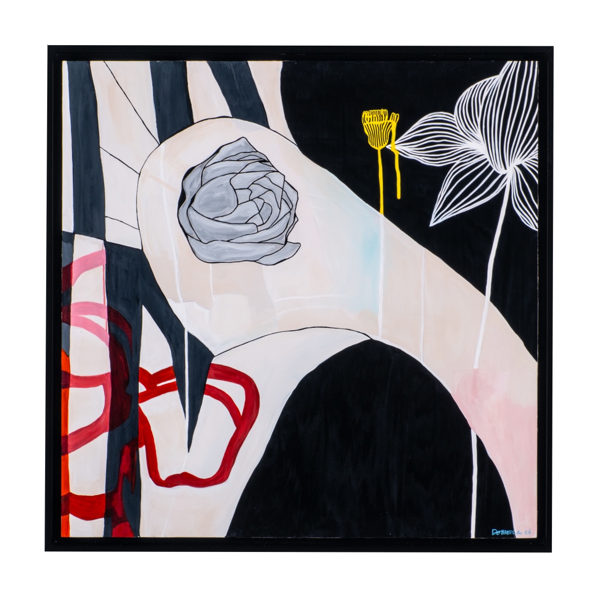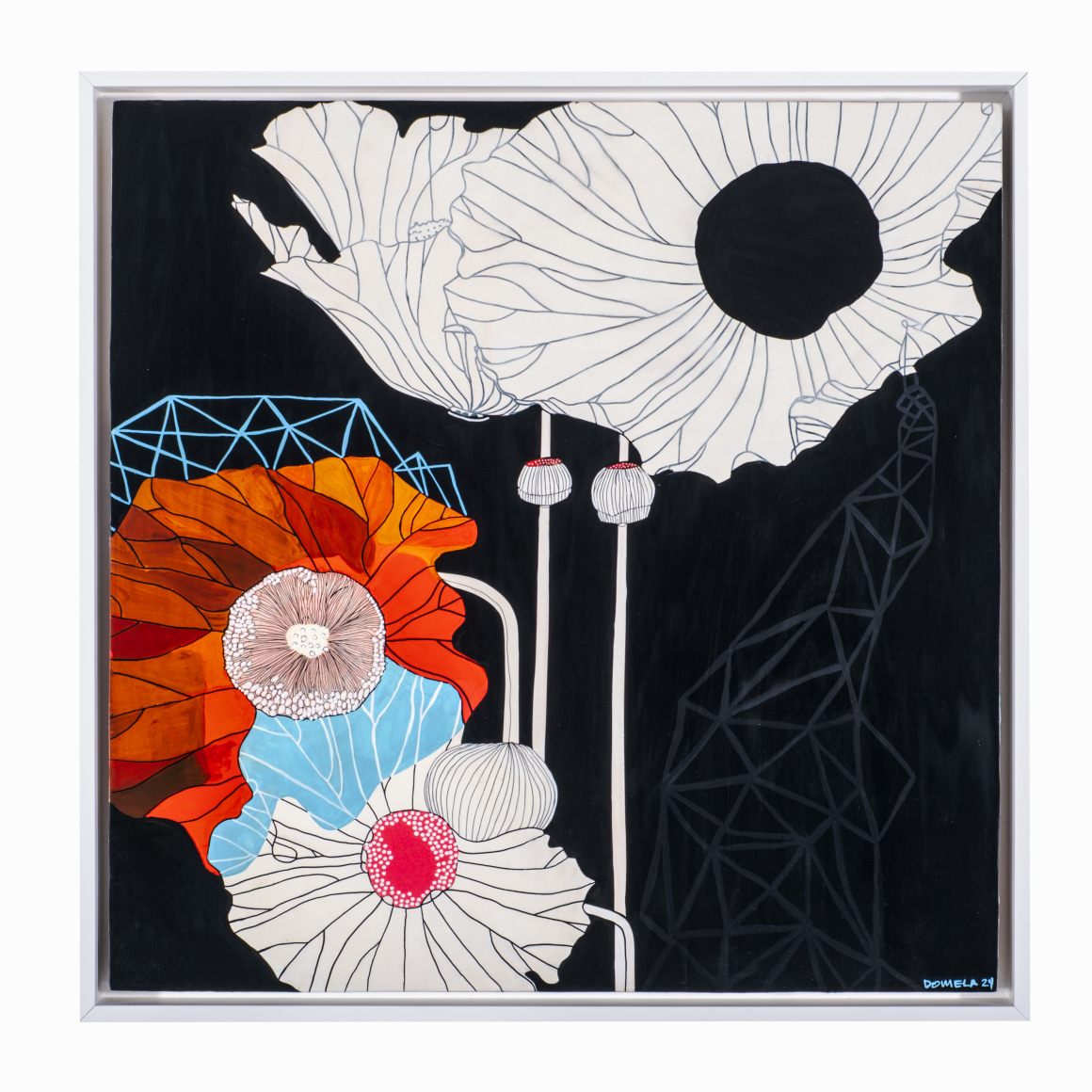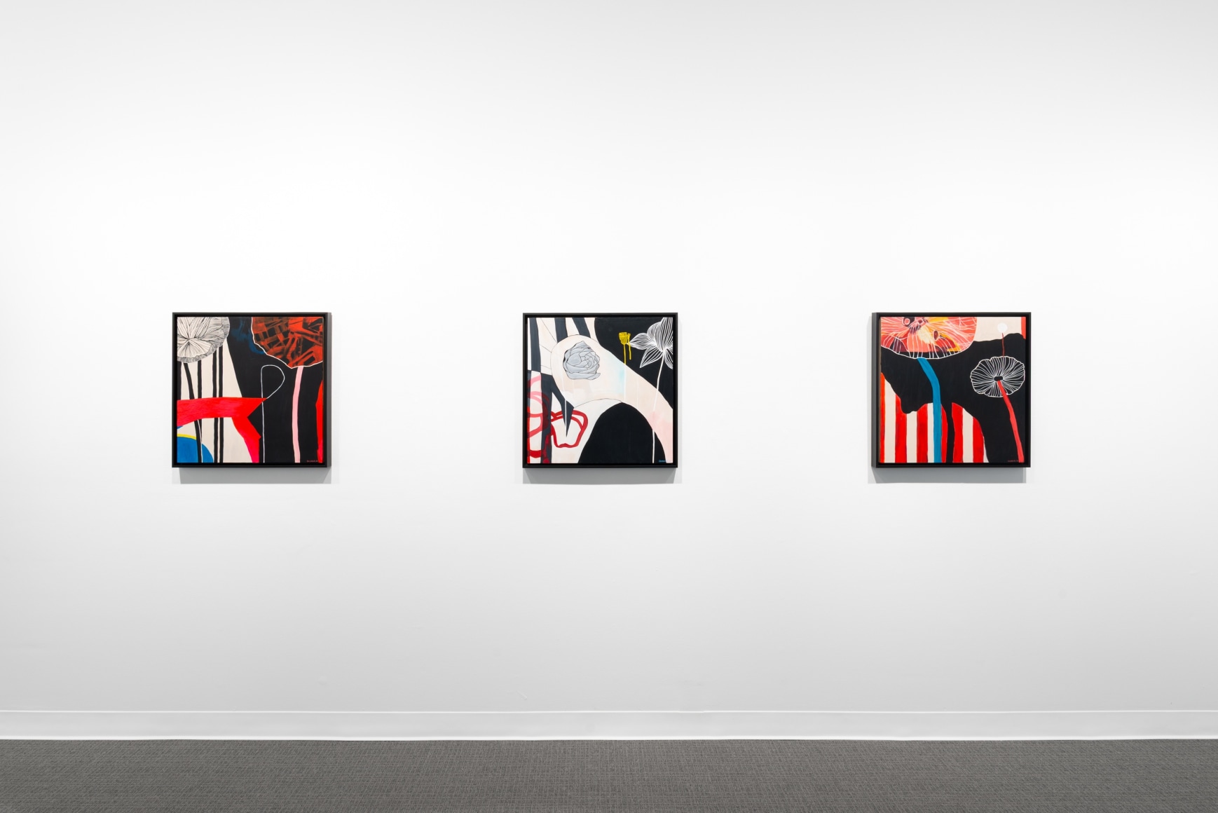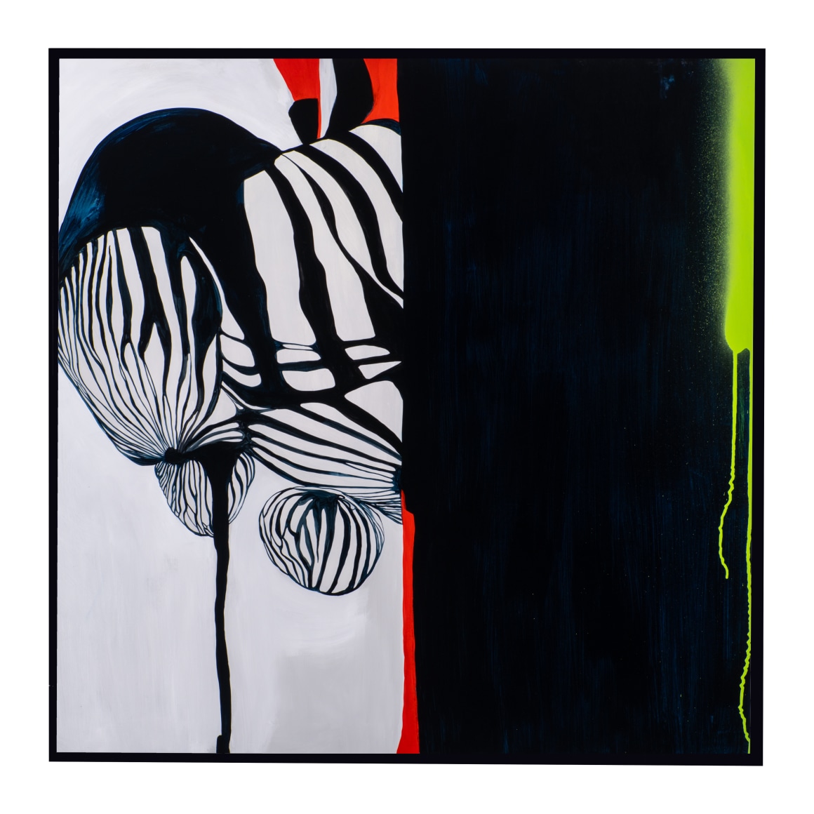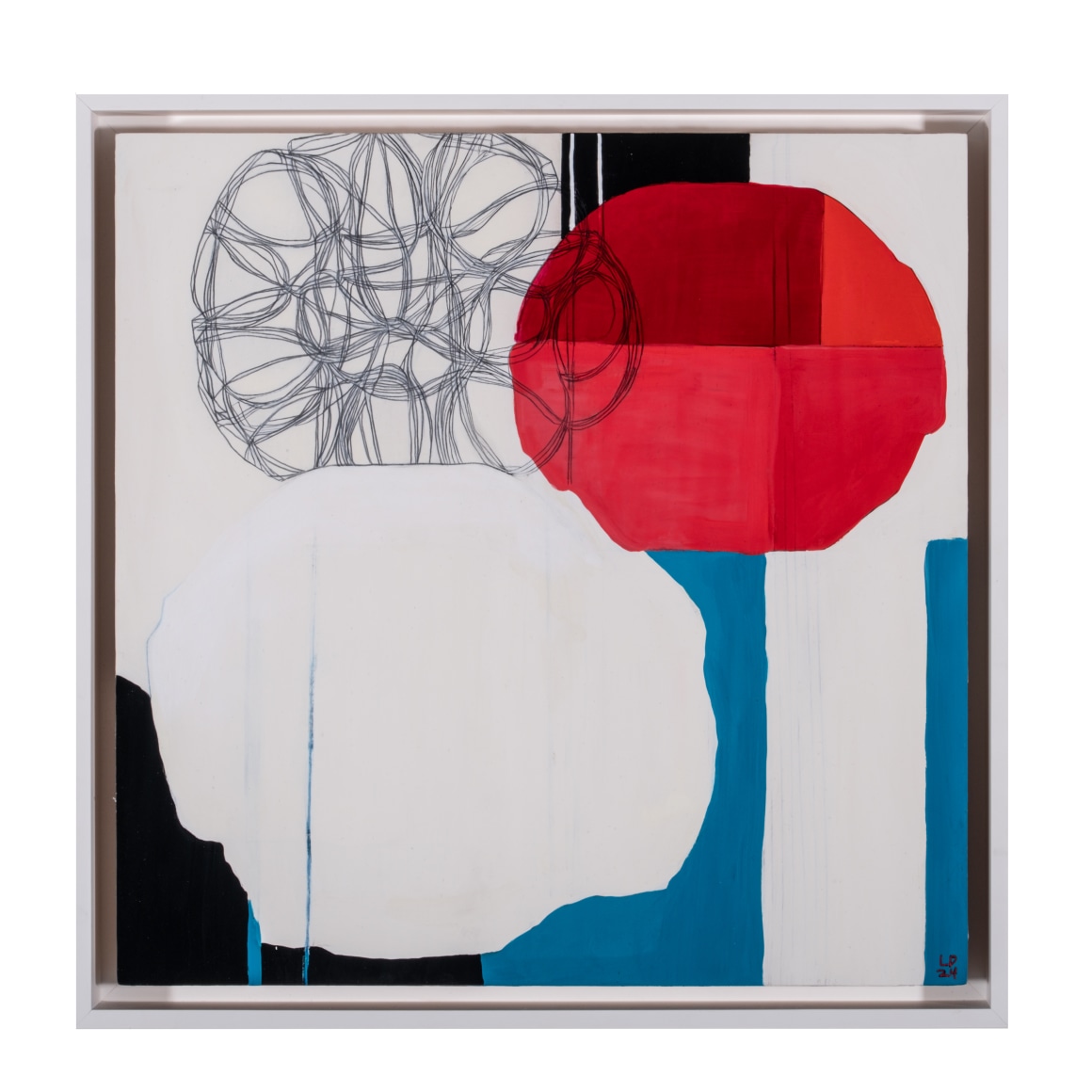 For the month of May, Russo Lee presents Defense Mechanisms by Laura Domela. For this compelling exhibition, Domela explores the complex ways we navigate fear. Visually, the paintings are a study in contrast, exploring emotional and psychological themes through the lens of contemporary abstraction. Bright, festive colors and floral motifs are layered over dark forms, stark geometries, and intricate line work, creating a dynamic push and pull between beauty and unease. Domela states, “Visually, I want my work to reflect this tension between vulnerability and protection – what we hide, how we armor ourselves.”
