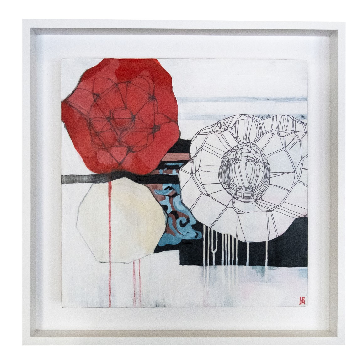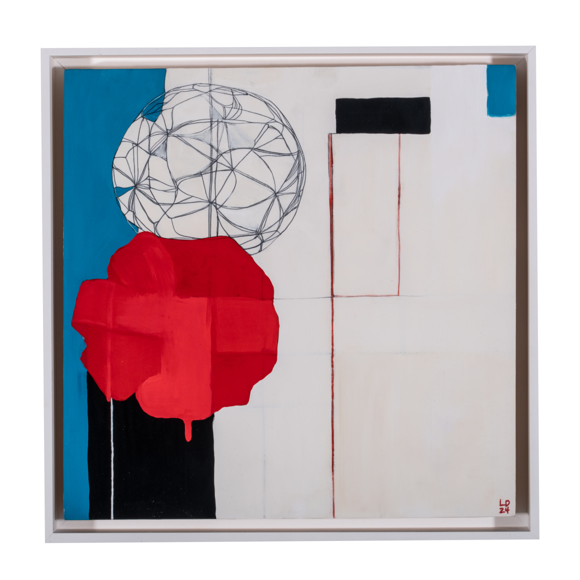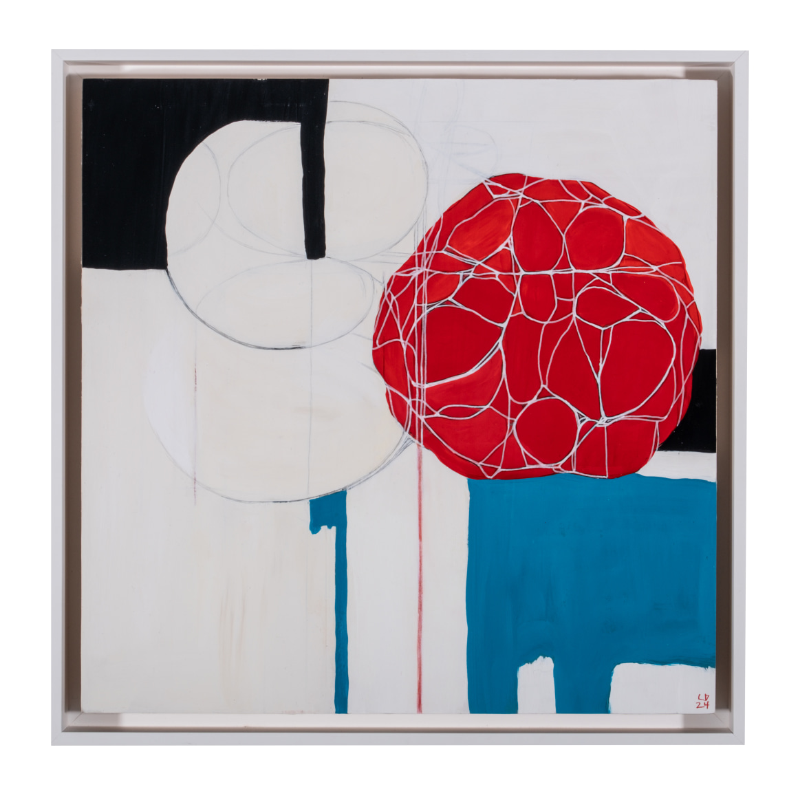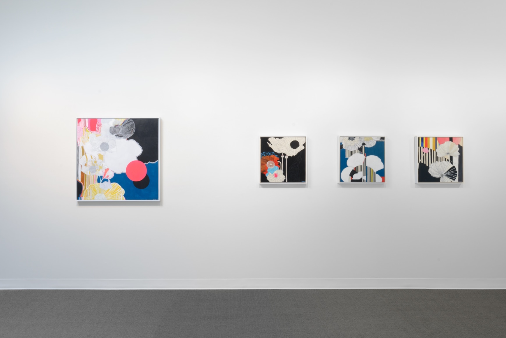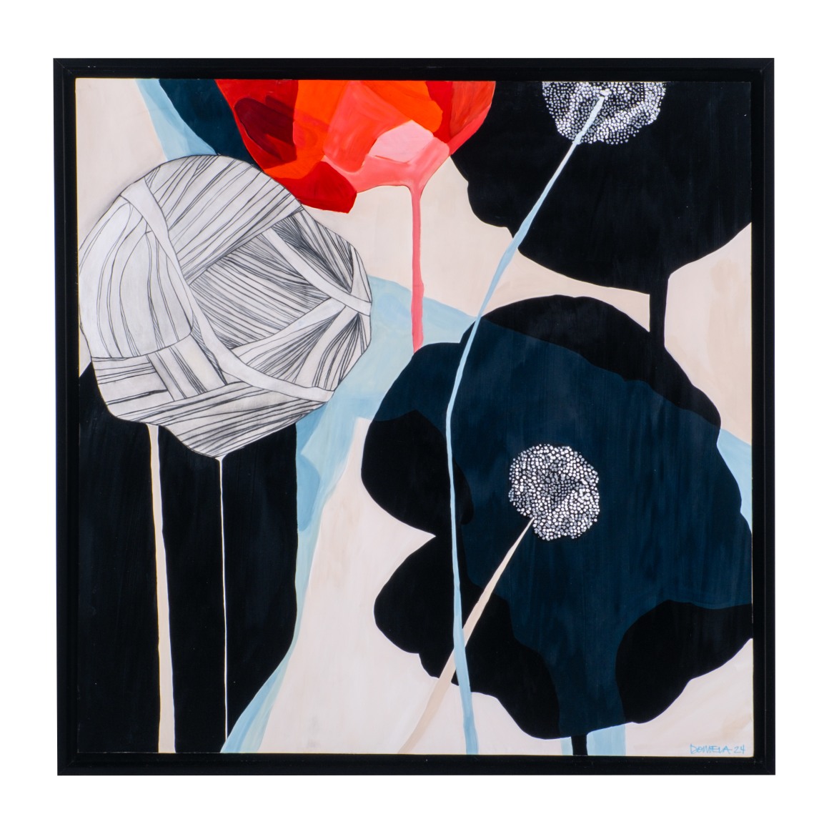 For the month of May, Russo Lee presents Defense Mechanisms by Laura Domela. For this compelling exhibition, Domela explores the complex ways we navigate fear. Visually, the paintings are a study in contrast, exploring emotional and psychological themes through the lens of contemporary abstraction. Bright, festive colors and floral motifs are layered over dark forms, stark geometries, and intricate line work, creating a dynamic push and pull between beauty and unease. Domela states, “Visually, I want my work to reflect this tension between vulnerability and protection – what we hide, how we armor ourselves.”