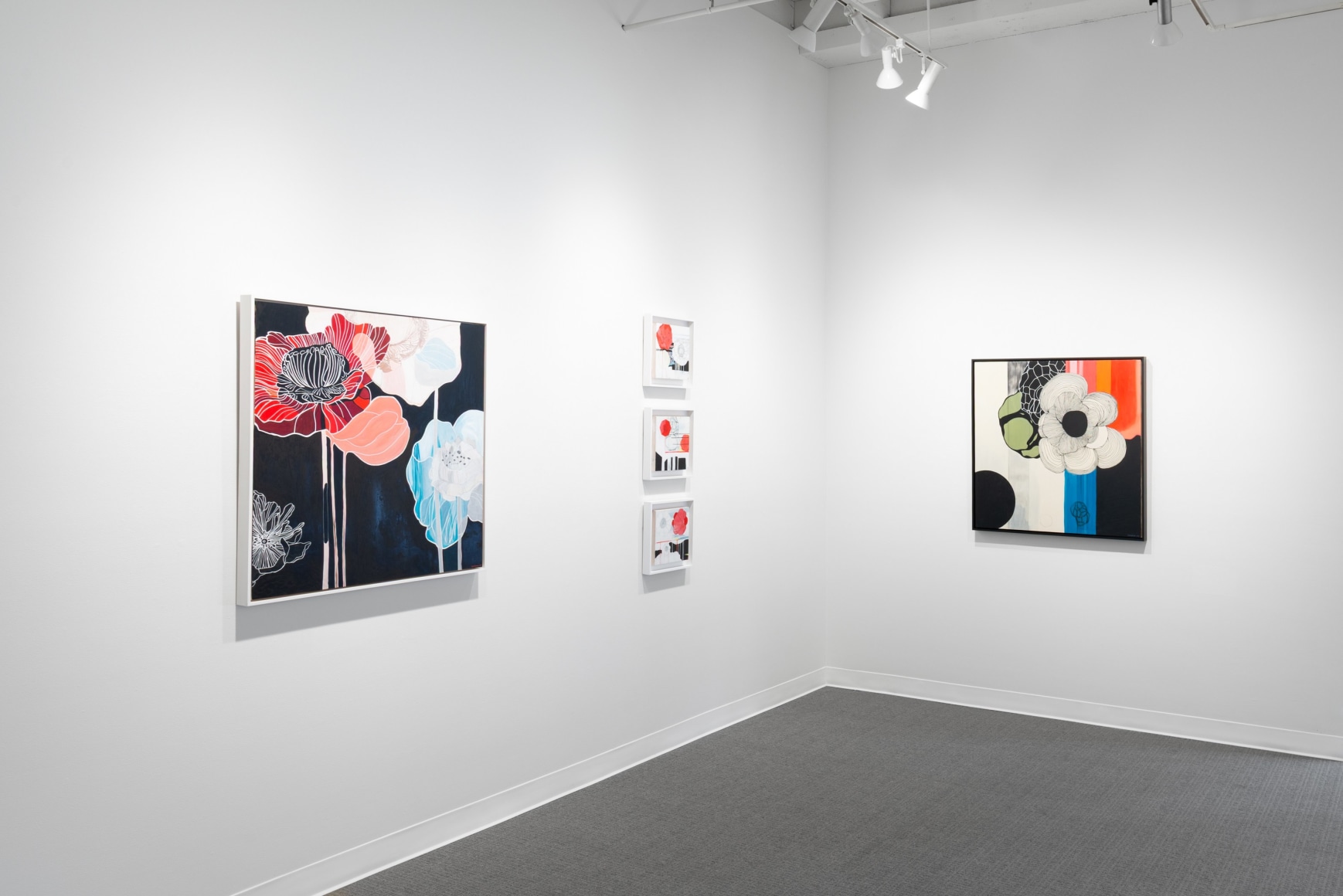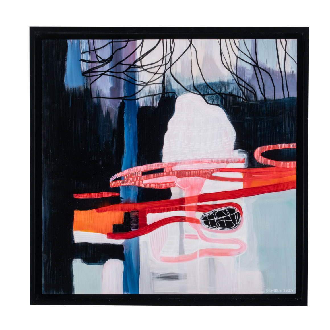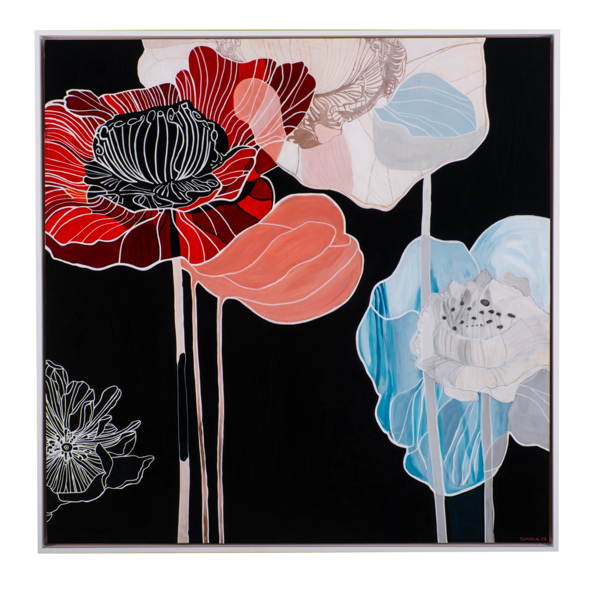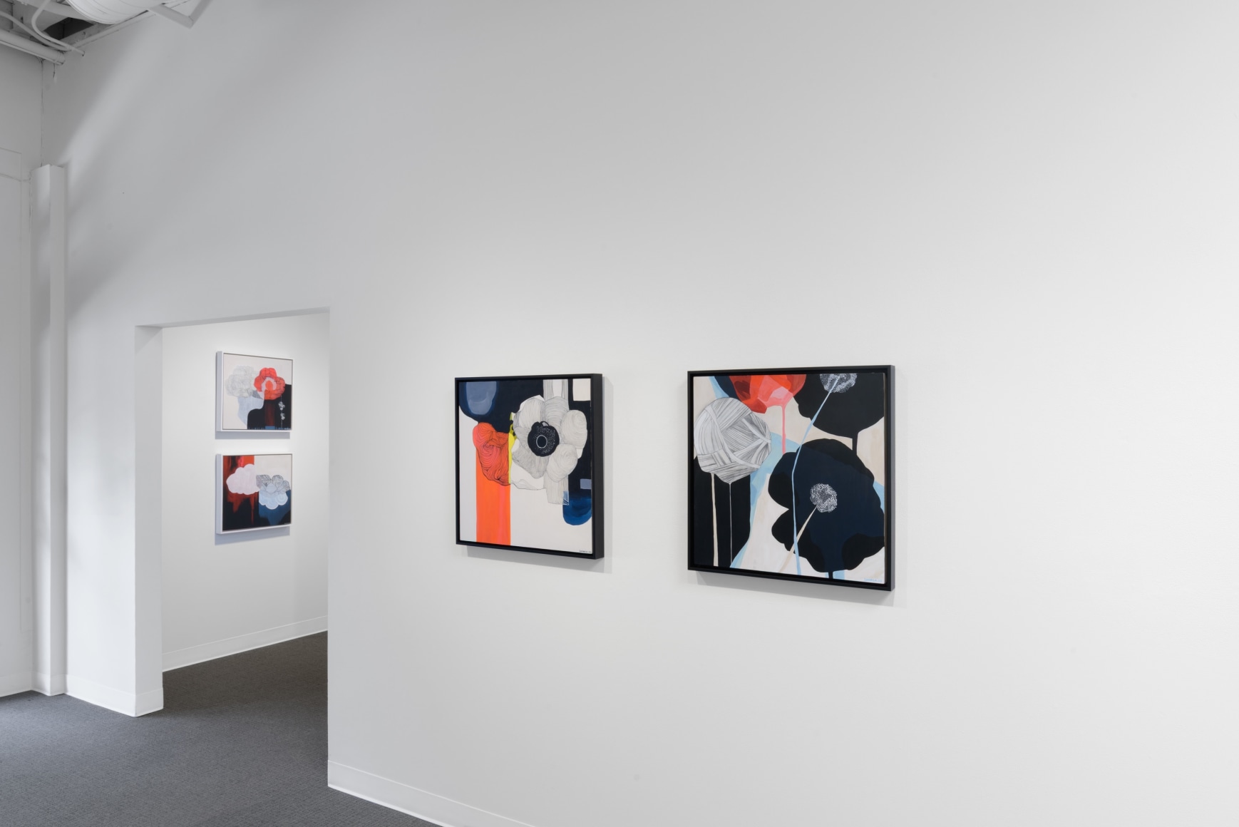 For the month of May, Russo Lee presents Defense Mechanisms by Laura Domela. For this compelling exhibition, Domela explores the complex ways we navigate fear. Visually, the paintings are a study in contrast, exploring emotional and psychological themes through the lens of contemporary abstraction. Bright, festive colors and floral motifs are layered over dark forms, stark geometries, and intricate line work, creating a dynamic push and pull between beauty and unease. Domela states, “Visually, I want my work to reflect this tension between vulnerability and protection – what we hide, how we armor ourselves.”