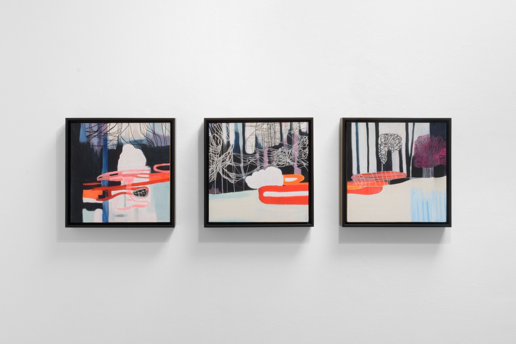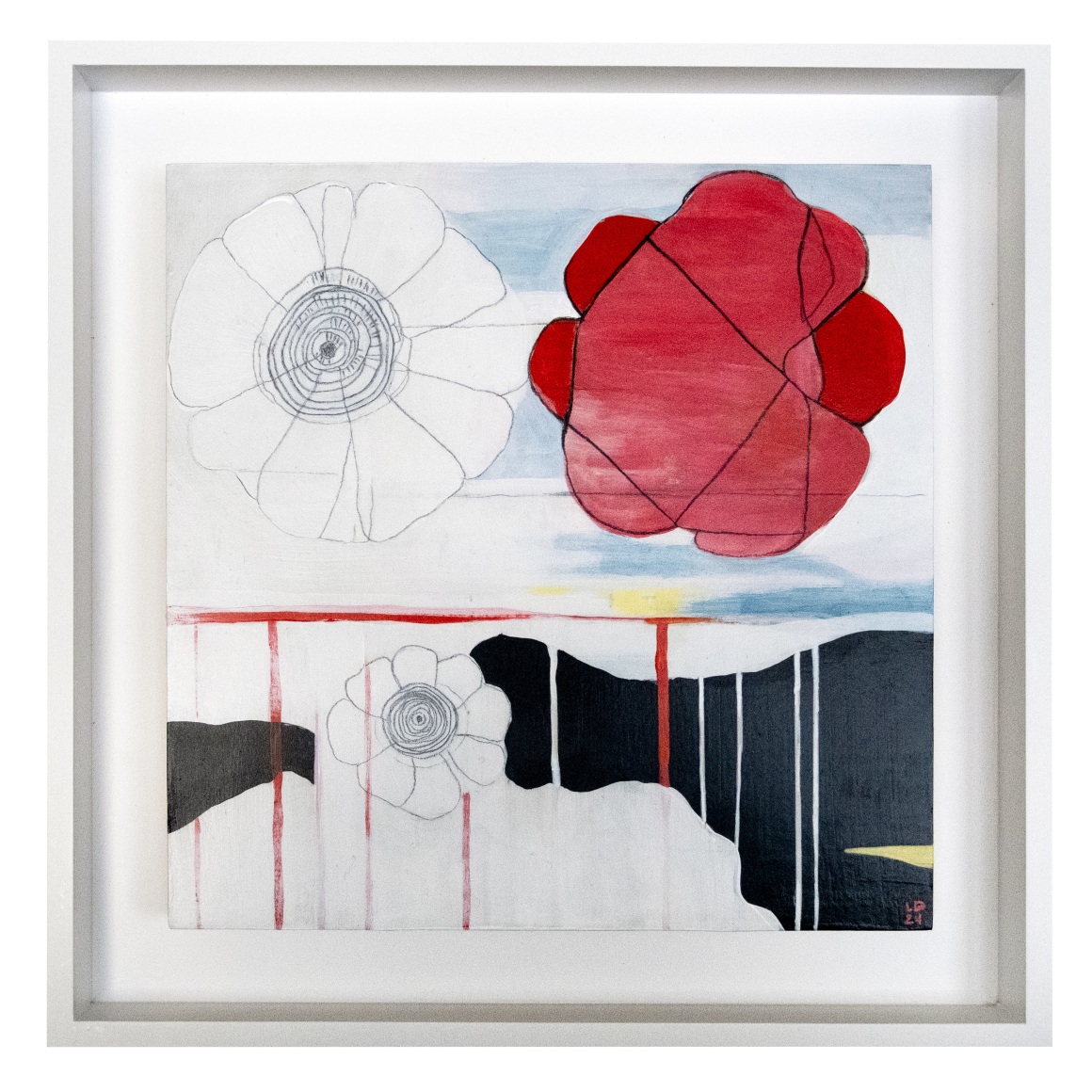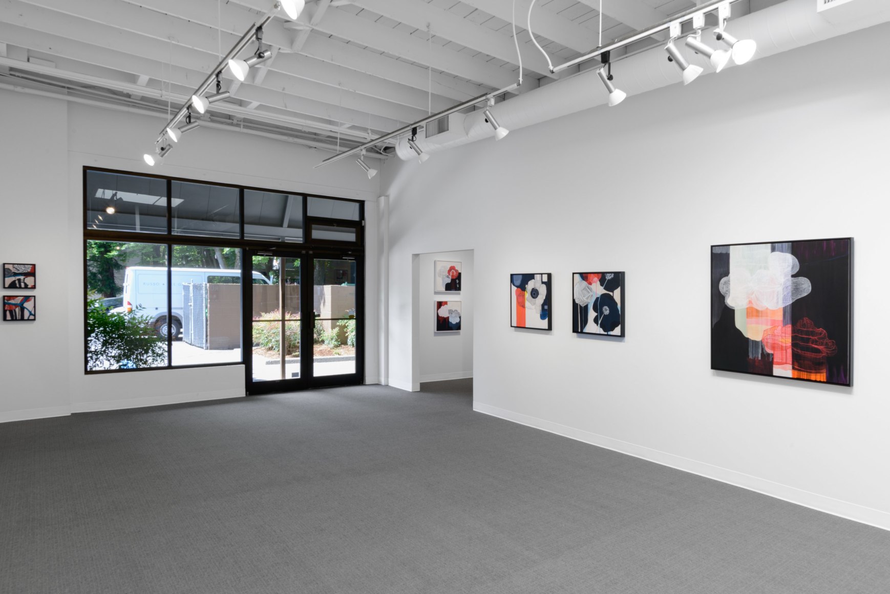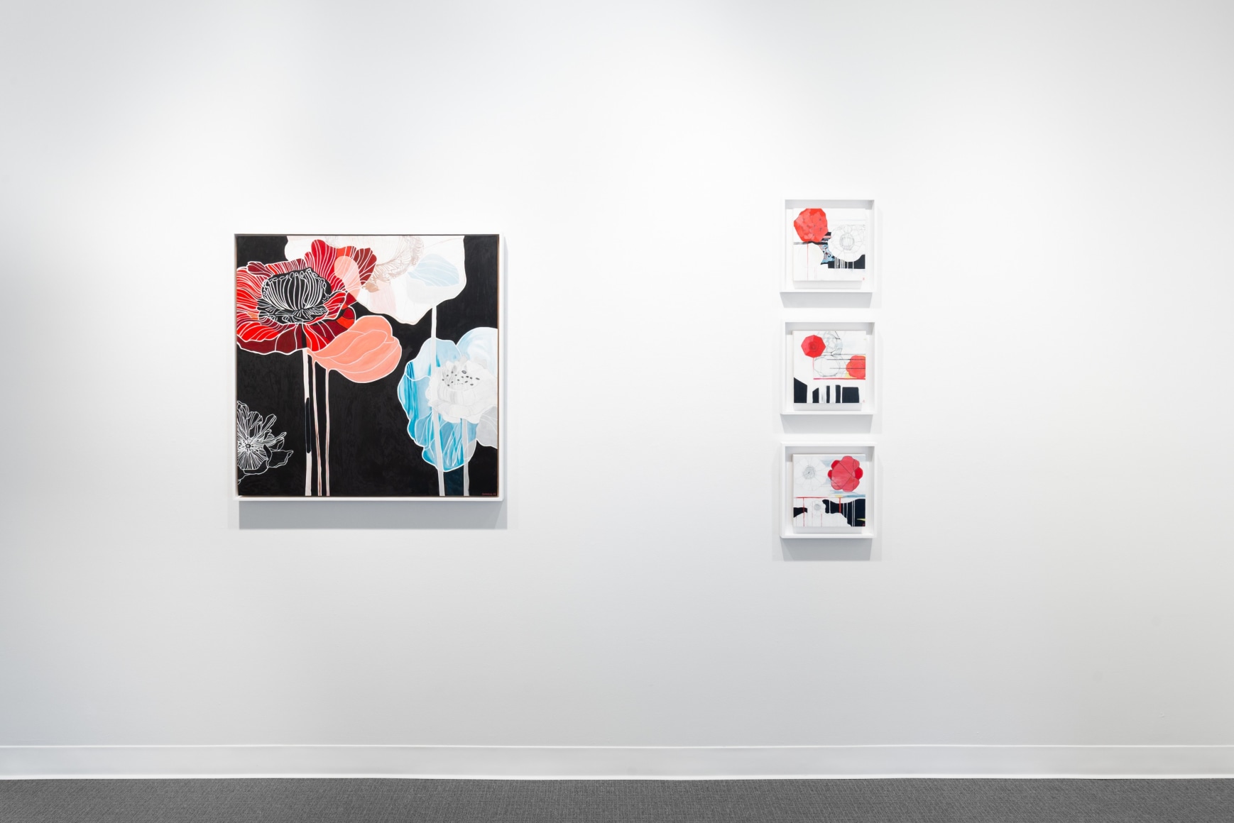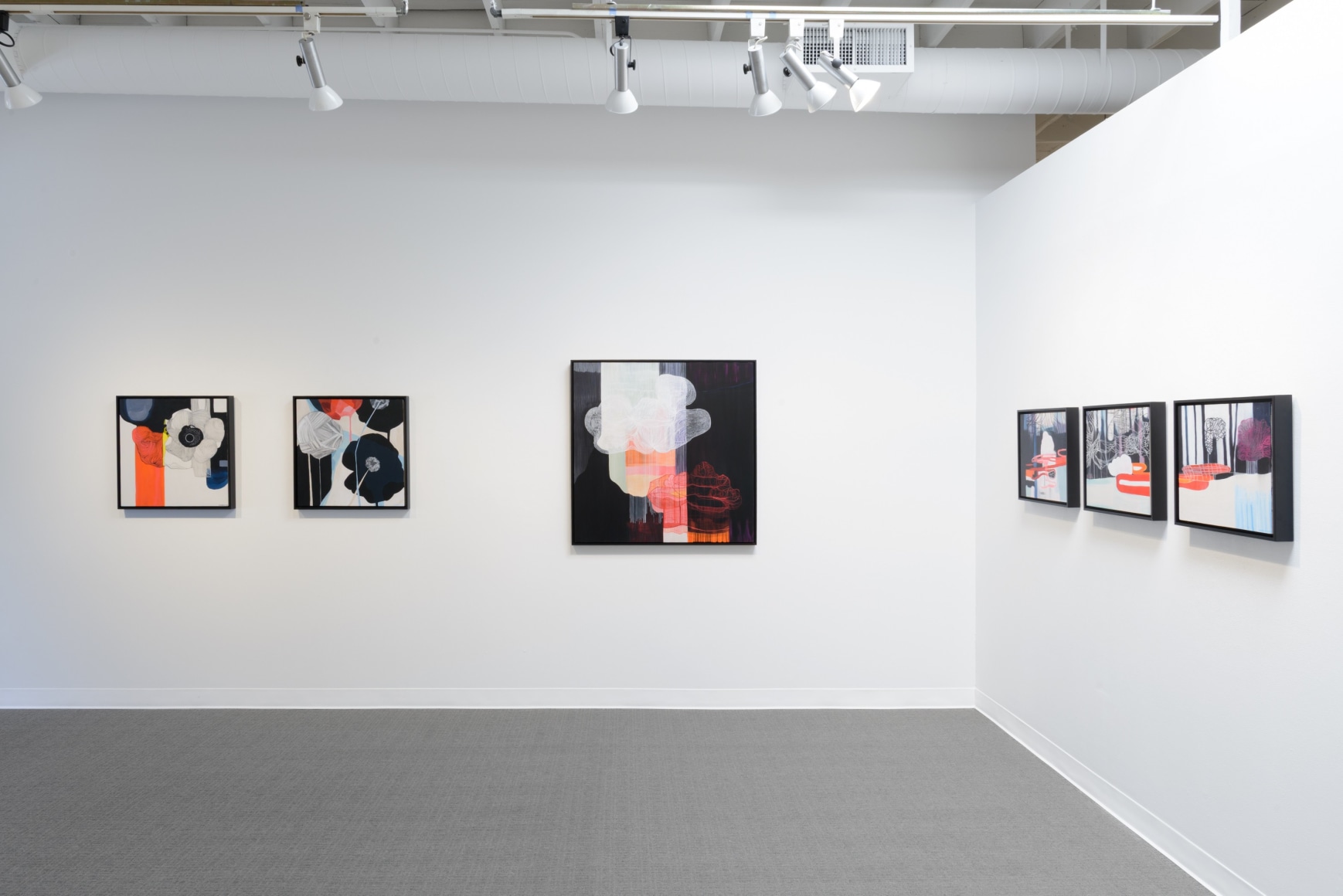 For the month of May, Russo Lee presents Defense Mechanisms by Laura Domela. For this compelling exhibition, Domela explores the complex ways we navigate fear. Visually, the paintings are a study in contrast, exploring emotional and psychological themes through the lens of contemporary abstraction. Bright, festive colors and floral motifs are layered over dark forms, stark geometries, and intricate line work, creating a dynamic push and pull between beauty and unease. Domela states, “Visually, I want my work to reflect this tension between vulnerability and protection – what we hide, how we armor ourselves.”