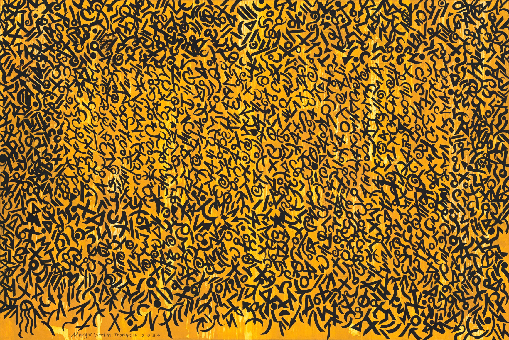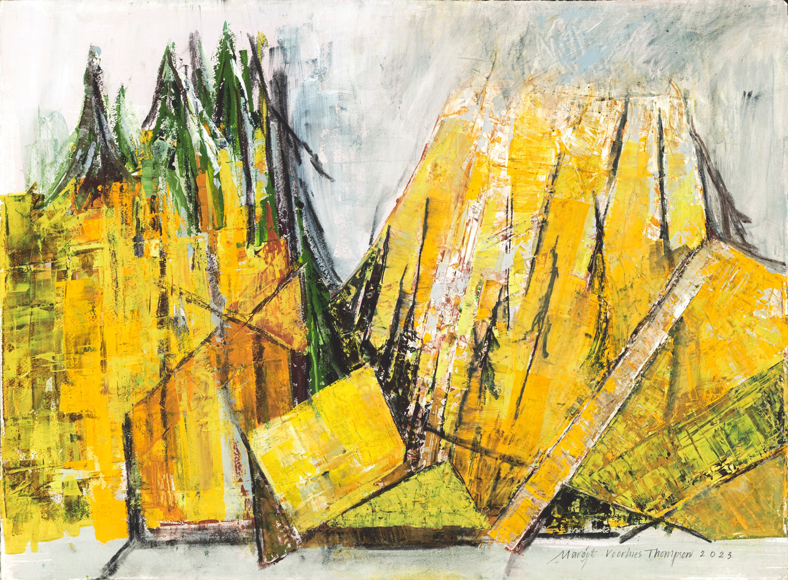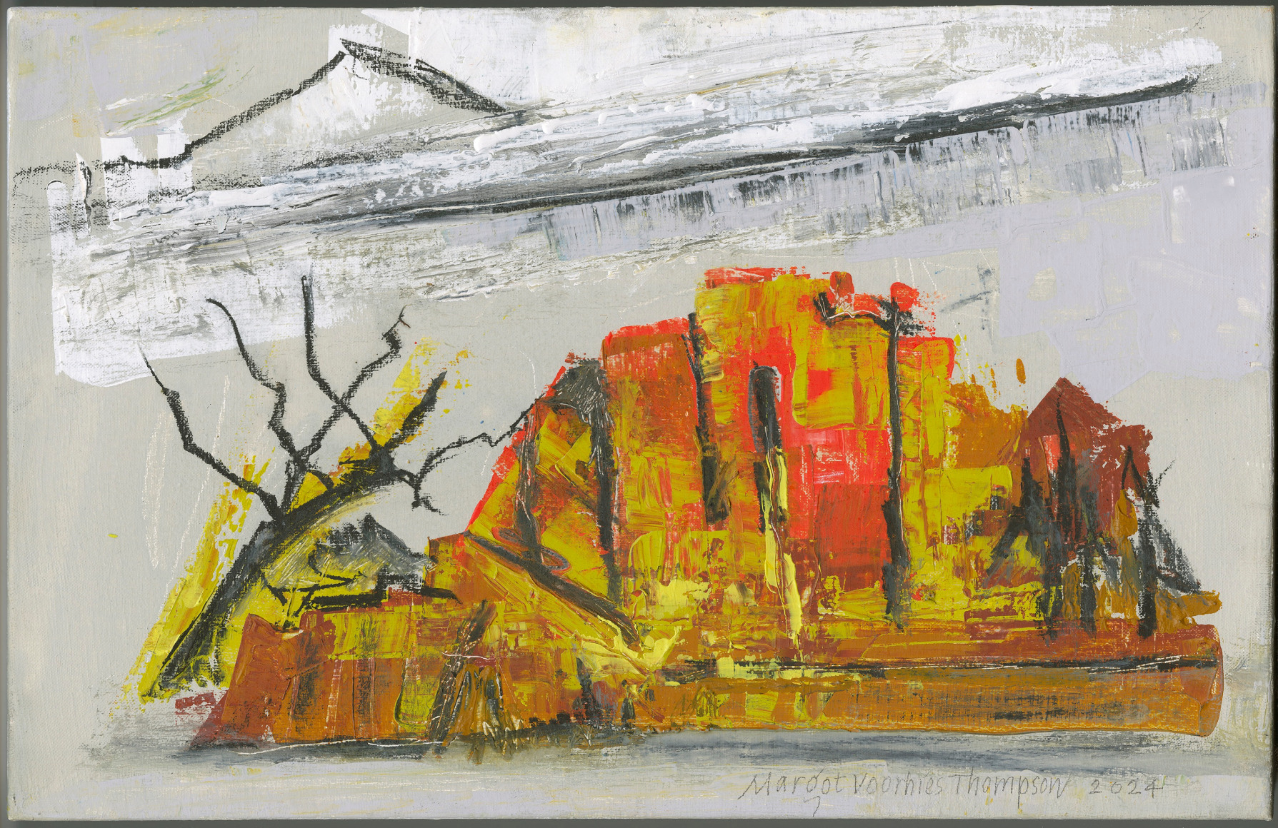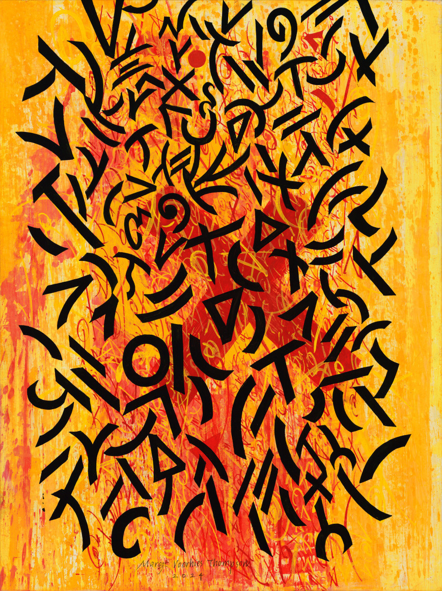 For the month of April, Russo Lee Gallery exhibits Letters from a Remote Landscape by Margot Voorhies Thompson. In the words of the artist, this exhibition “reveals the transcendent nature and austere beauty of this remote landscape”. Referring to the Oregon Outback, Thompson has immersed herself for decades in the geographic features of Southeastern Oregon. Her paintings evoke a joyful excitement and capture the unique qualities found in the natural environment; dark green conifers, dramatic cloudscapes, acid green lichens, violet gray and red oxide rocks. The ancient petroglyphs on the faces of massive rocks are also a source of subject matter for Thompson. As a calligrapher, the artist is studied in both ancient symbols and early alphabets. Several paintings in this new body of work incorporate these wonderous glyphs.