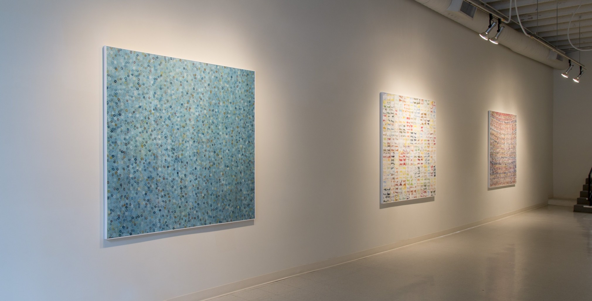 Portland artist Whitney Nye explores composition through gesture and the intersection of texture and color. In this exhibition she continues to experiment with her interest in abstract oil and acrylic paintings that suggest movement and light. This body of work is in response to how Nye, an urban dweller, is keenly aware of how the environment she is in is rapidly changing in front of her in a stressful way. Her response to this is to create an alternate environment through painting so that she gains more awareness and quiet as she surrounds herself with a “site” that quenches the desire for a more nourishing view. Through the physicality of large-scale painting she is able to this, to create a site of adequate scale. For Nye, it is about creating new pathways while honoring the past. Speaking of this direction in her work, which she introduced in her 2013 show, she notes that “these paintings have a few or many layers, stories hide underneath, but what you see is the captured abstraction, the still of an animated surface.” Nye’s tradition of incorporating pattern and collage echoes within these new, painted canvases. Motion, rhythm and energy fill their surfaces.